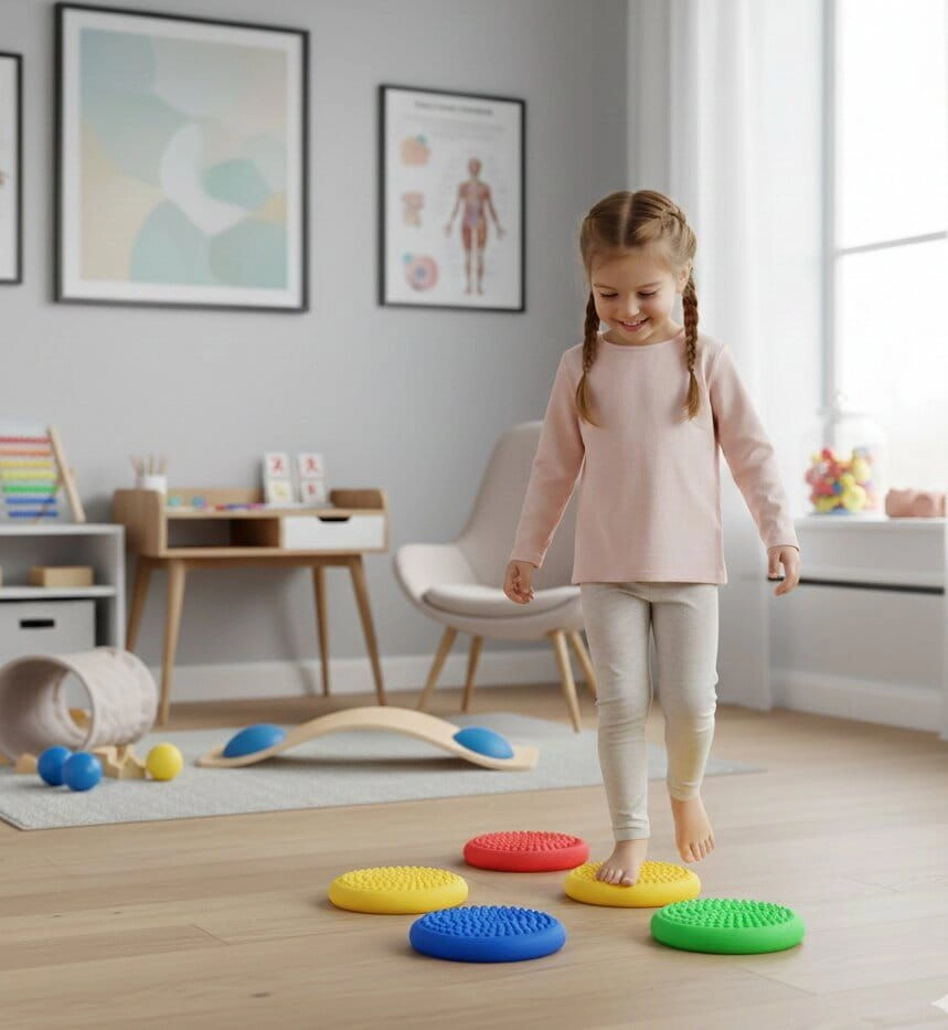 Открийте забавен начин да подпомогнете равновесието, координацията и сетивното възприятие при деца и възрастни. Този комплект от четири цветни диска с изразена текстура предлага неплъзгаща се повърхност, приятен масаж на ходилата и ефективна тренировка за стабилност. Изработени от безопасни материали – без фталати, BPA и тежки метали – идеални за домашни тренировки, детски градини и физиотерапия.