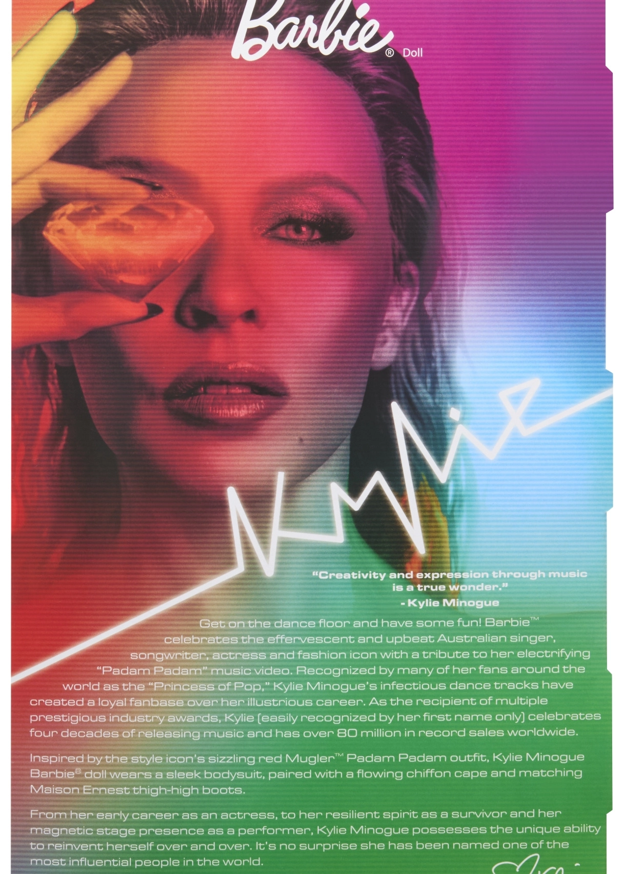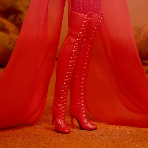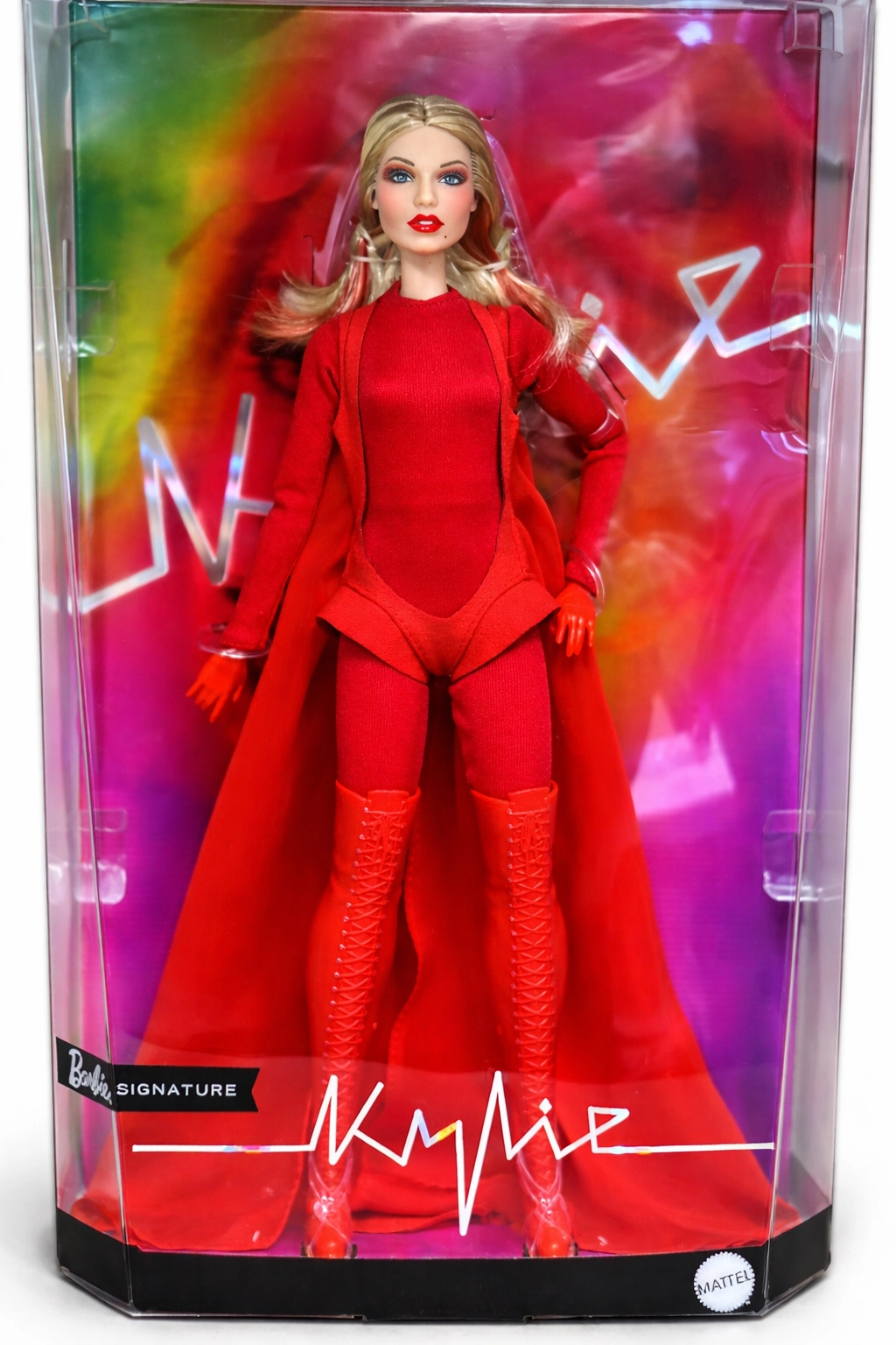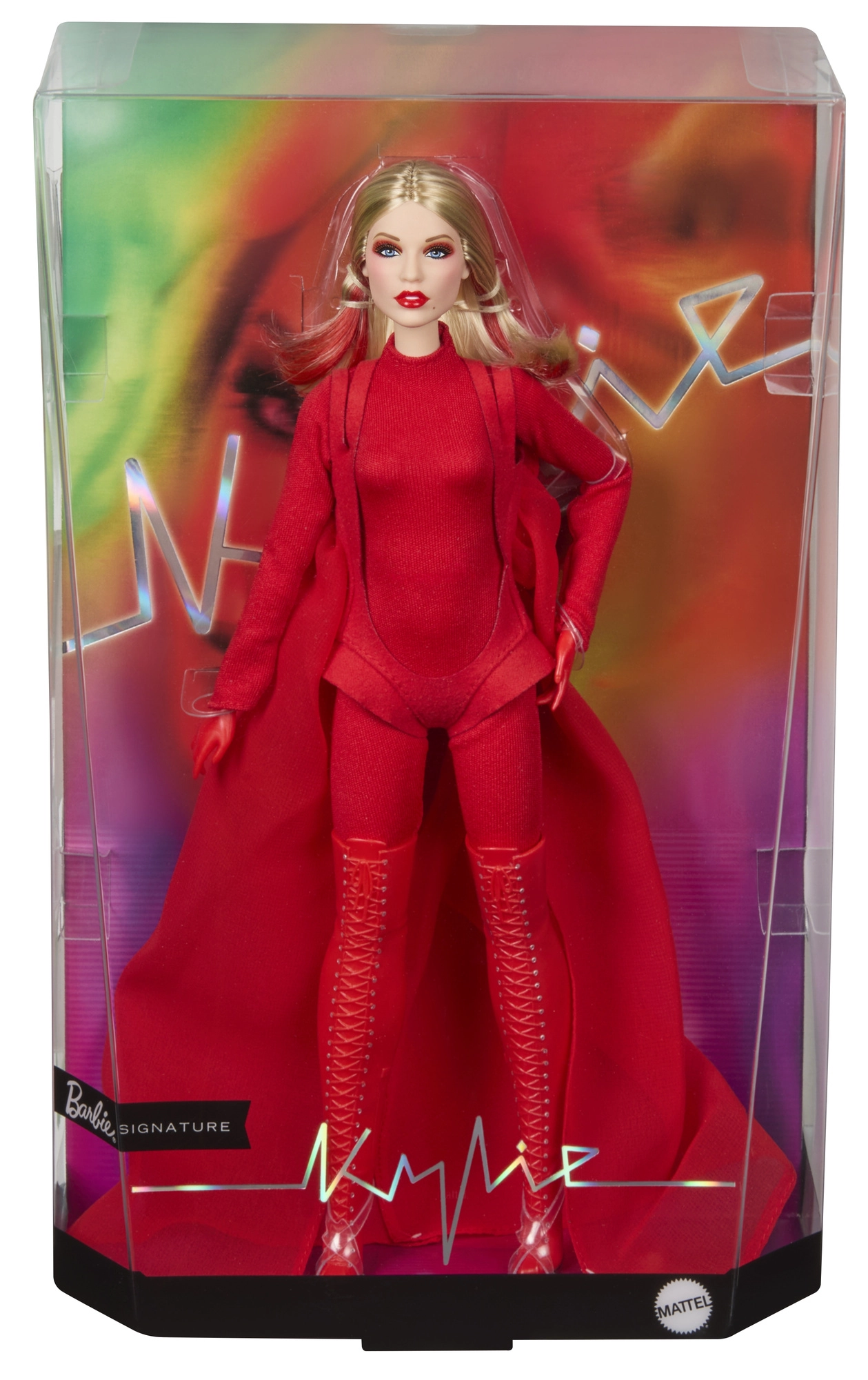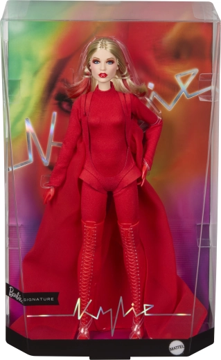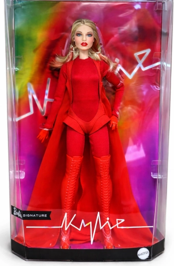 Това колекционерско издание на Barbie отдава почит на вдъхновяващи жени в серията Role Models. Куклата пресъздава Кайли Миноуг в драматична червена стилизация, вдъхновена от музикално видео, с дълга руса коса и фини червени кичури, сини очи и прецизен грим за автентична, сценична визия.