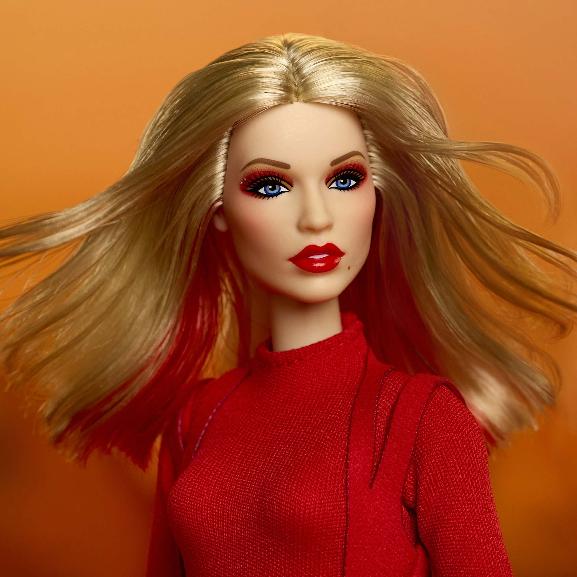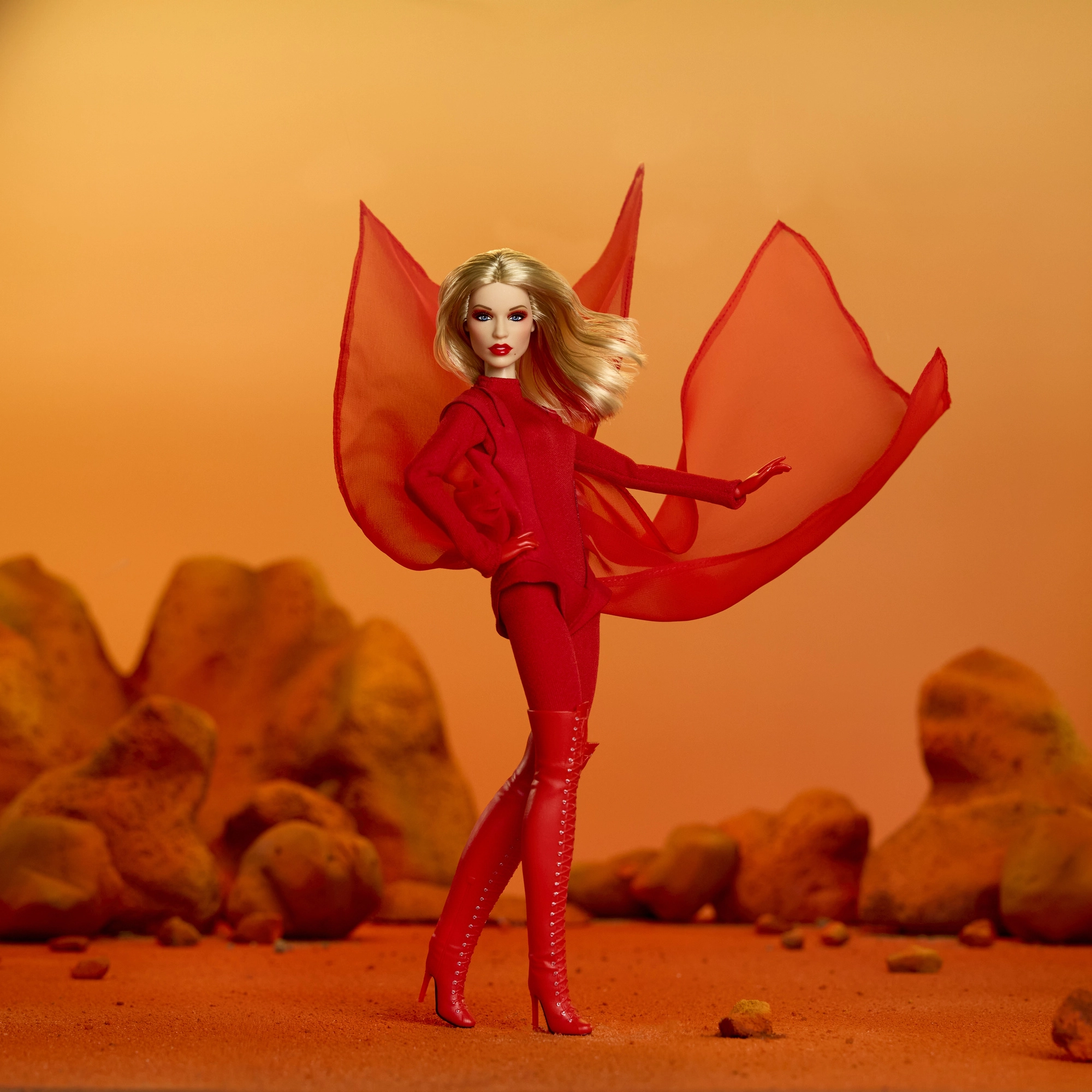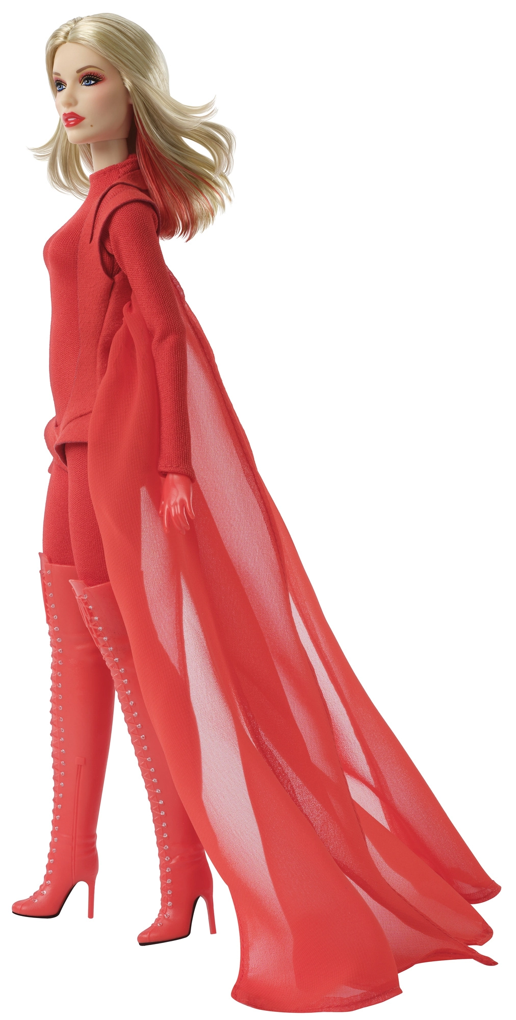 Това колекционерско издание на Barbie отдава почит на вдъхновяващи жени в серията Role Models. Куклата пресъздава Кайли Миноуг в драматична червена стилизация, вдъхновена от музикално видео, с дълга руса коса и фини червени кичури, сини очи и прецизен грим за автентична, сценична визия.