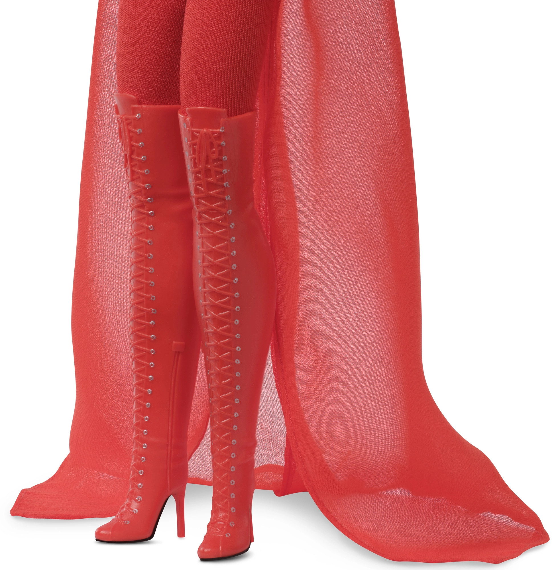 Тоалетът включва прилепнал червен гащеризон с полупрозрачен ефект и къса горна част, която преминава в дълго падащо наметало. Визията е допълнена от ботуши над коляното с връзки и високи токове – истински statement акцент за витрината.