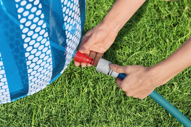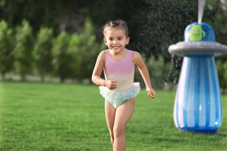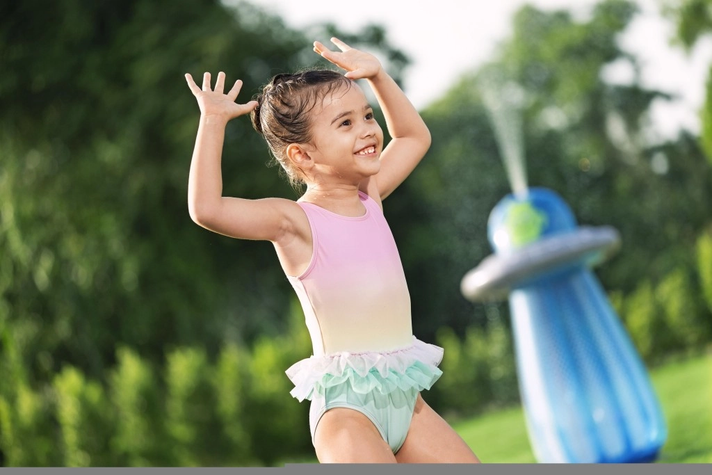 След свързване към стандартен градински маркуч от горната част на НЛО-то се активира освежаващ разпръсквач, който създава игрива фонтанна струя за децата.