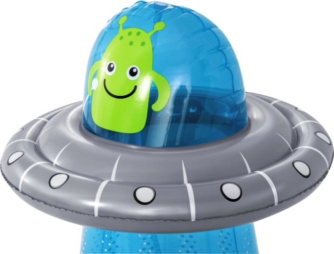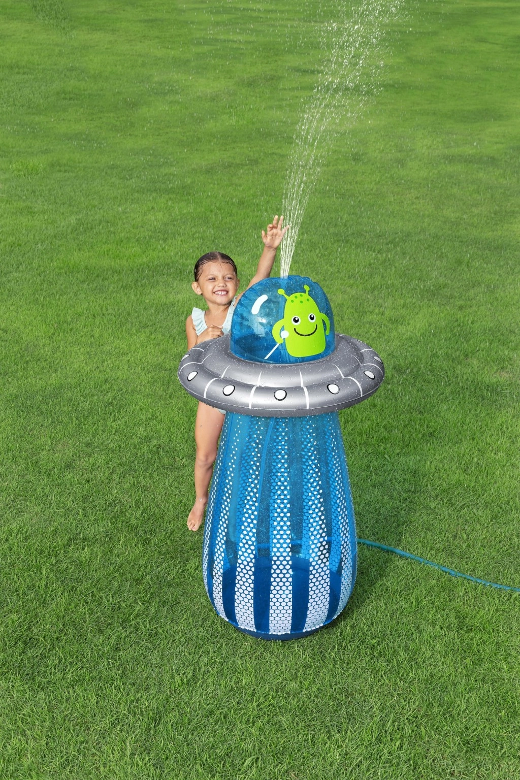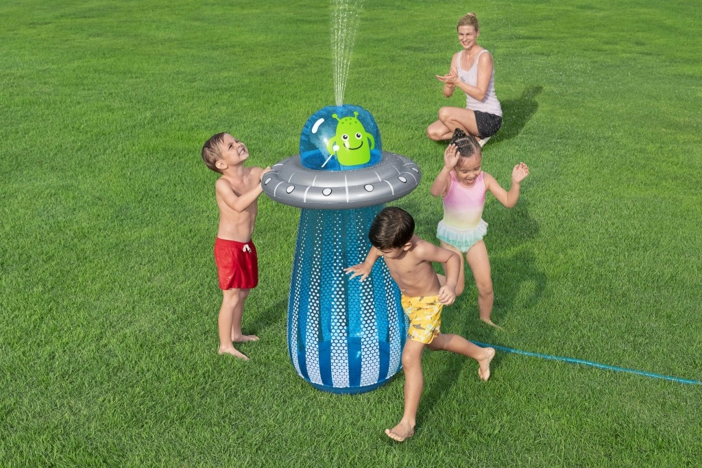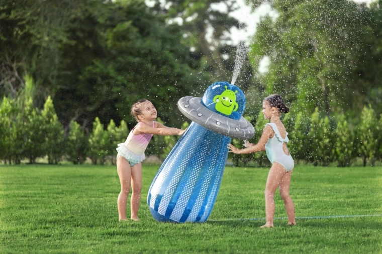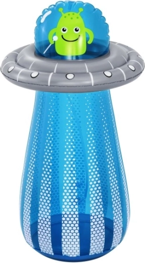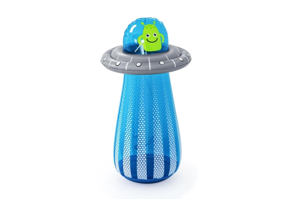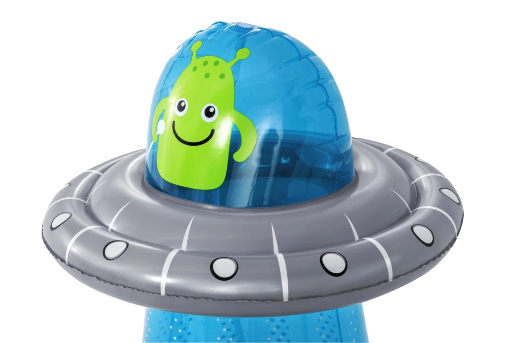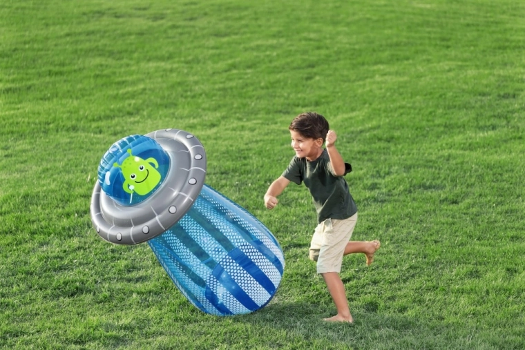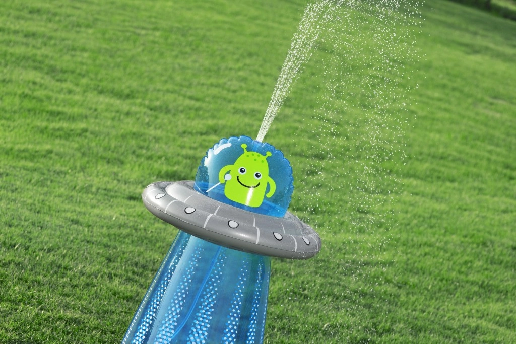 Надуваемото НЛО с приятелско извънземно носи на децата актив movement и водно освежаване в едно. След свързване на маркуча от горната част се пуска водна фонтана, която превръща градината в игрища за летни забавления. Благодарение на вградената водна камера в долната част играчката е стабилна и еластично се връща след удари.