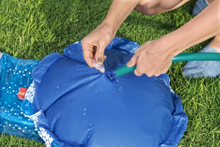 Изработено от издръжливо PVC с прозрачен син „кокон“ и сив пръстен. В комплекта е включена ремонтна лепенка за бързи поправки.