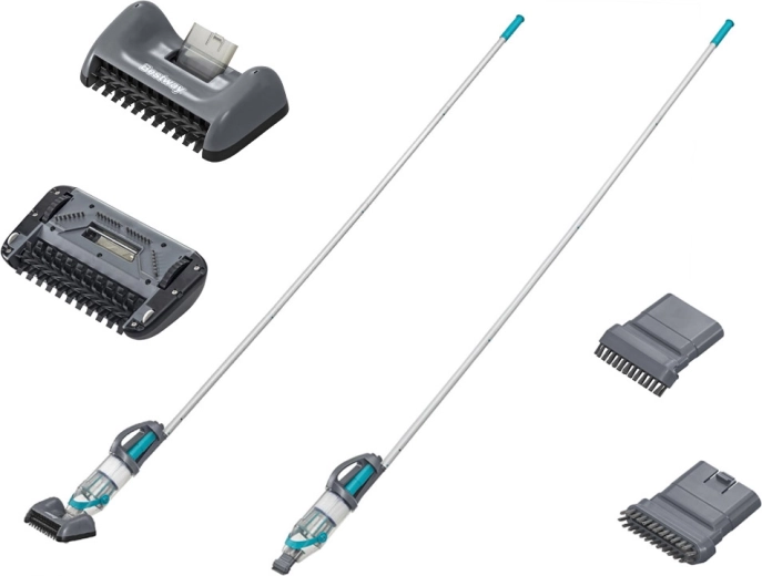 В комплекта ще намерите две сменяеми почистващи глави за различни повърхности — от равното дъно до ъглите и стъпалата. Модулният прът с дължина 2 m осигурява удобен обсег без навеждане; след откачане AquaGrip се превръща в пъргава ръчна прахосмукачка за детайлно почистване. LED светлината прави работата по-прегледна дори при по-лоши условия.