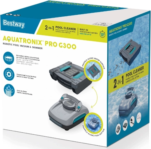 BESTWAY Aquatronix Pro G300 е модерен, напълно автоматичен безжичен робот 2-в-1, който почиства дъното на басейна и повърхността на водата. Благодарение на вградената батерия работи до 120 минути без заплитащи се кабели. Големите контейнери за отпадъци (3,5 л за дъното и 6 л за повърхността) и умните сензори за автоматично включване/изключване осигуряват удобна, безопасна и ефективна поддръжка, особено за надземни басейни с плоско дъно.