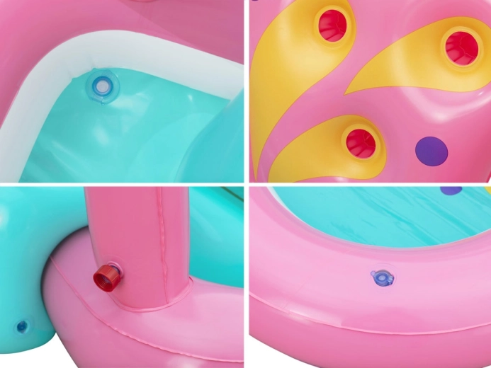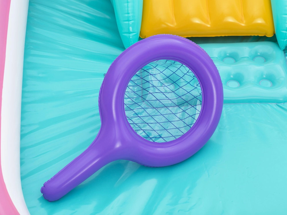 В комплекта има забавни плаващи играчки и надуваеми елементи във формата на пеперуди и рингове. Меките стени и омекотените приземявания повишават комфорта и безопасността. Здравият винил се почиства лесно, а включената ремонтна лепенка удължава живота на продукта. Достатъчно е да свържете маркуча, да надуете и забавата може да започне.