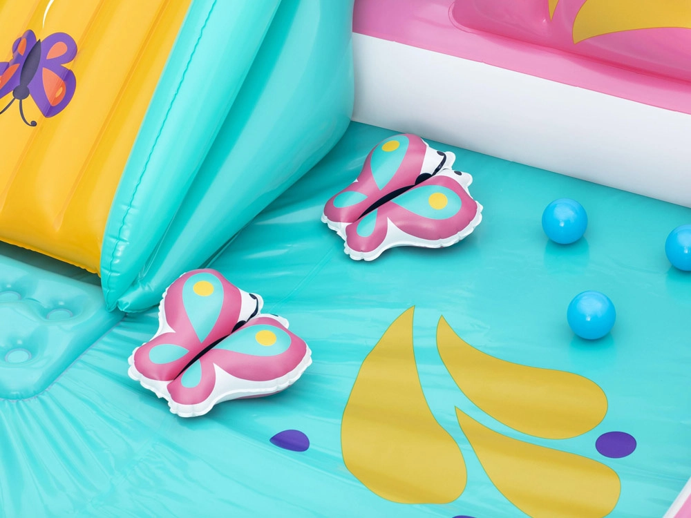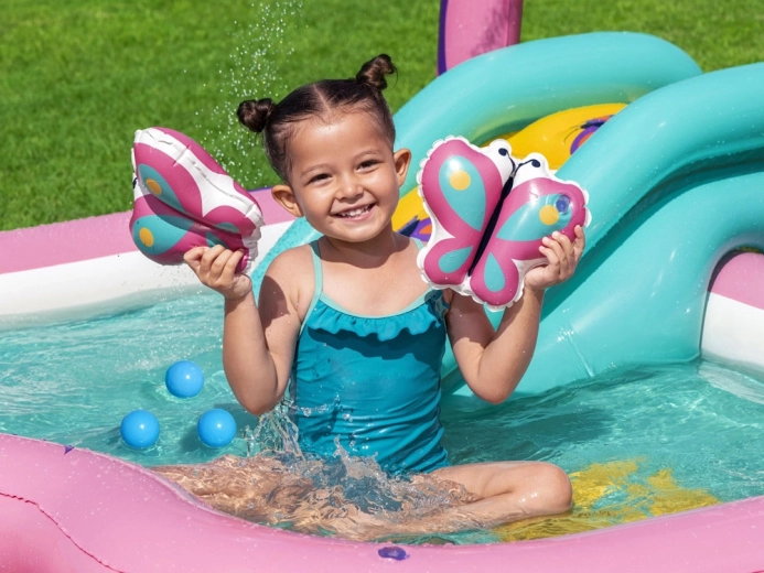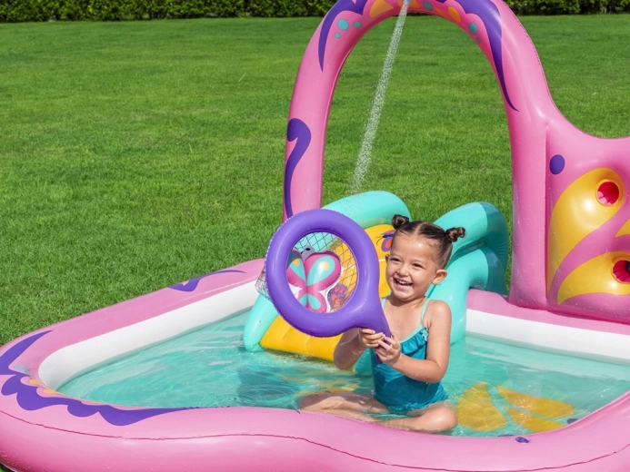 Надуваемият воден развлекателен център Bestway Пеперуда превръща двора в безопасно място, изпълнено с радост. Благодарение на компактните размери 180 × 180 × 117 cm се побира и в по-малки пространства, но въпреки това предлага много активности: спускане в плитка зона за плискане, душ-арка, свързана към градински маркуч, и отвори за хвърляне и сортиране на топчета, които развиват фината моторика.