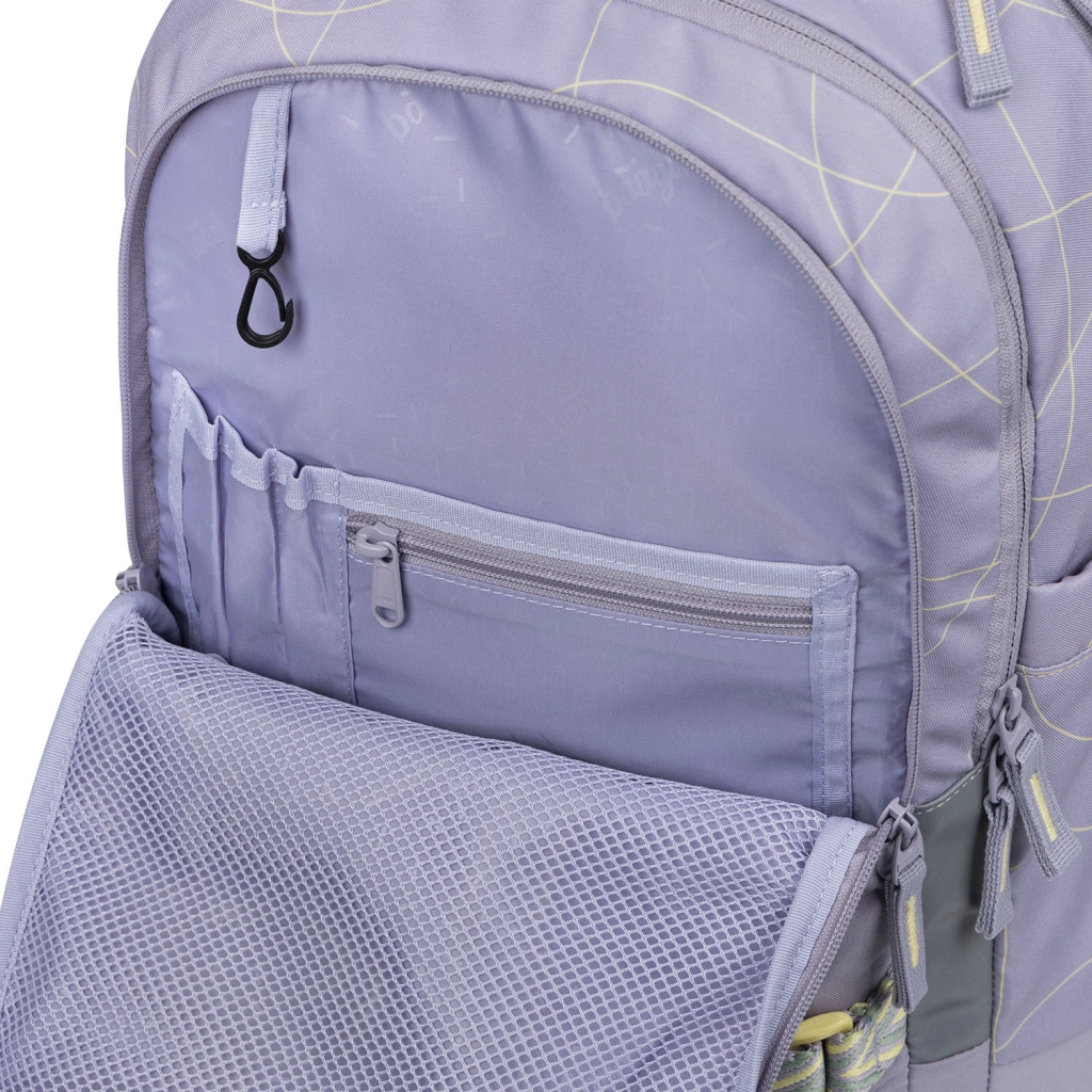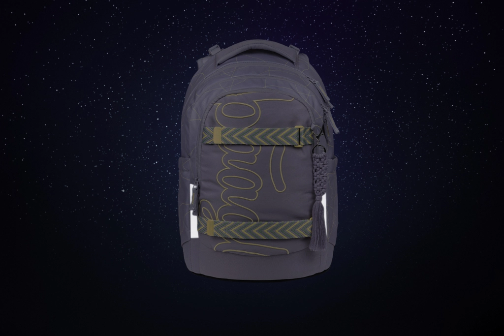 Триотделно разпределение с ясен органайзер, кадифен джоб за лаптоп или таблет и практични двупосочни ципове YKK осигуряват бърз достъп и сигурно съхранение на училищни принадлежности и електроника. Странични джобове от здрав материал побират бутилка за вода и са съобразени с дизайна на раницата. Издръжлив, водоустойчив материал със сертификат GRS и ярки светлоотразителни елементи повишават безопасността и щадят природата.