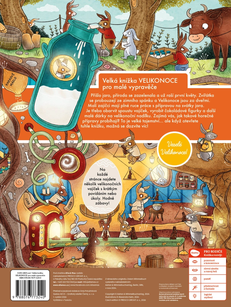 Открийте магията на пролетта с детска книга, която съчетава приказния свят на Великден и забавни задачи. Малките читатели тръгват с зайчетата, които подготвят рисувани яйца, шоколадови фигурки и малки подаръци. На всяка страница ги очакват кратки разказчета и интерактивни активности, които развиват въображението и вниманието.