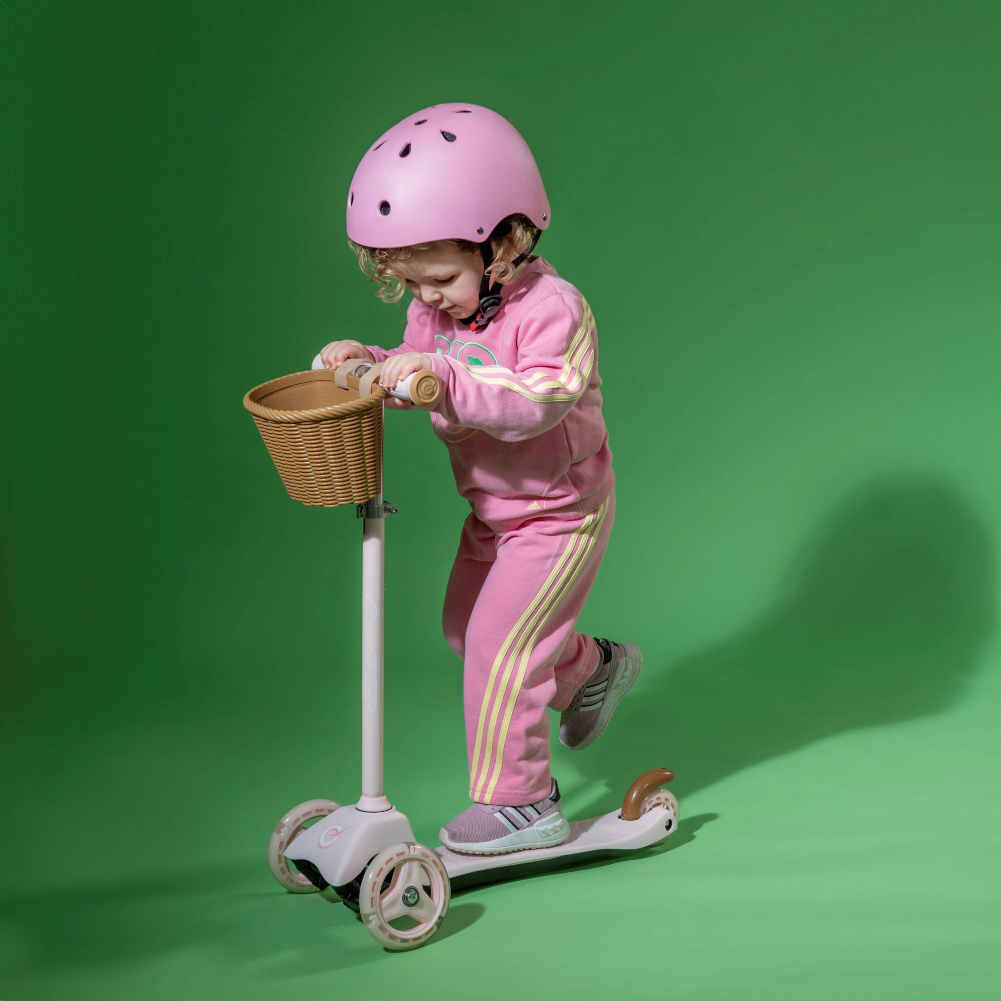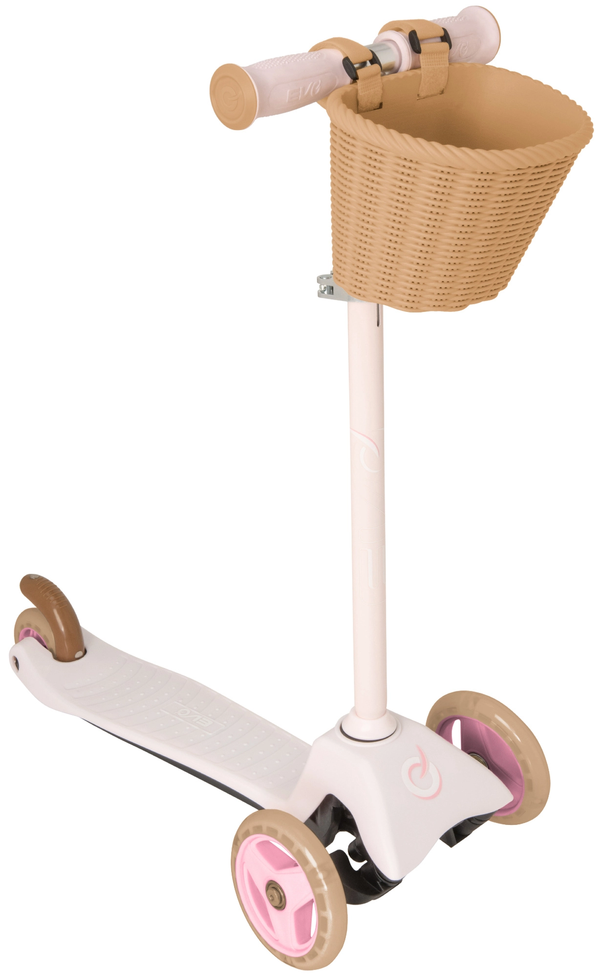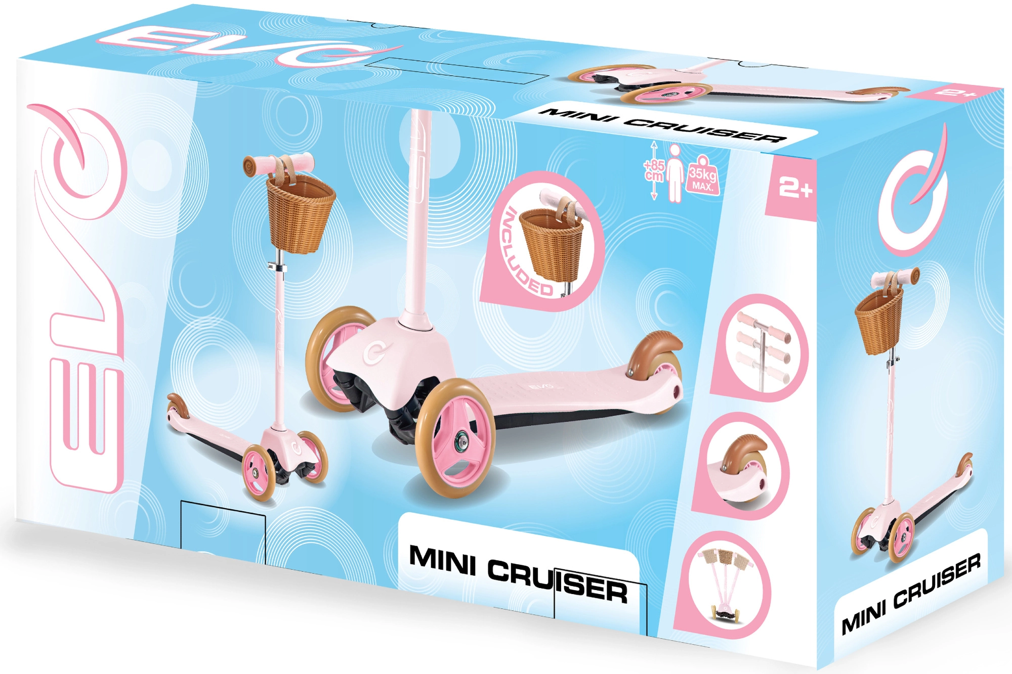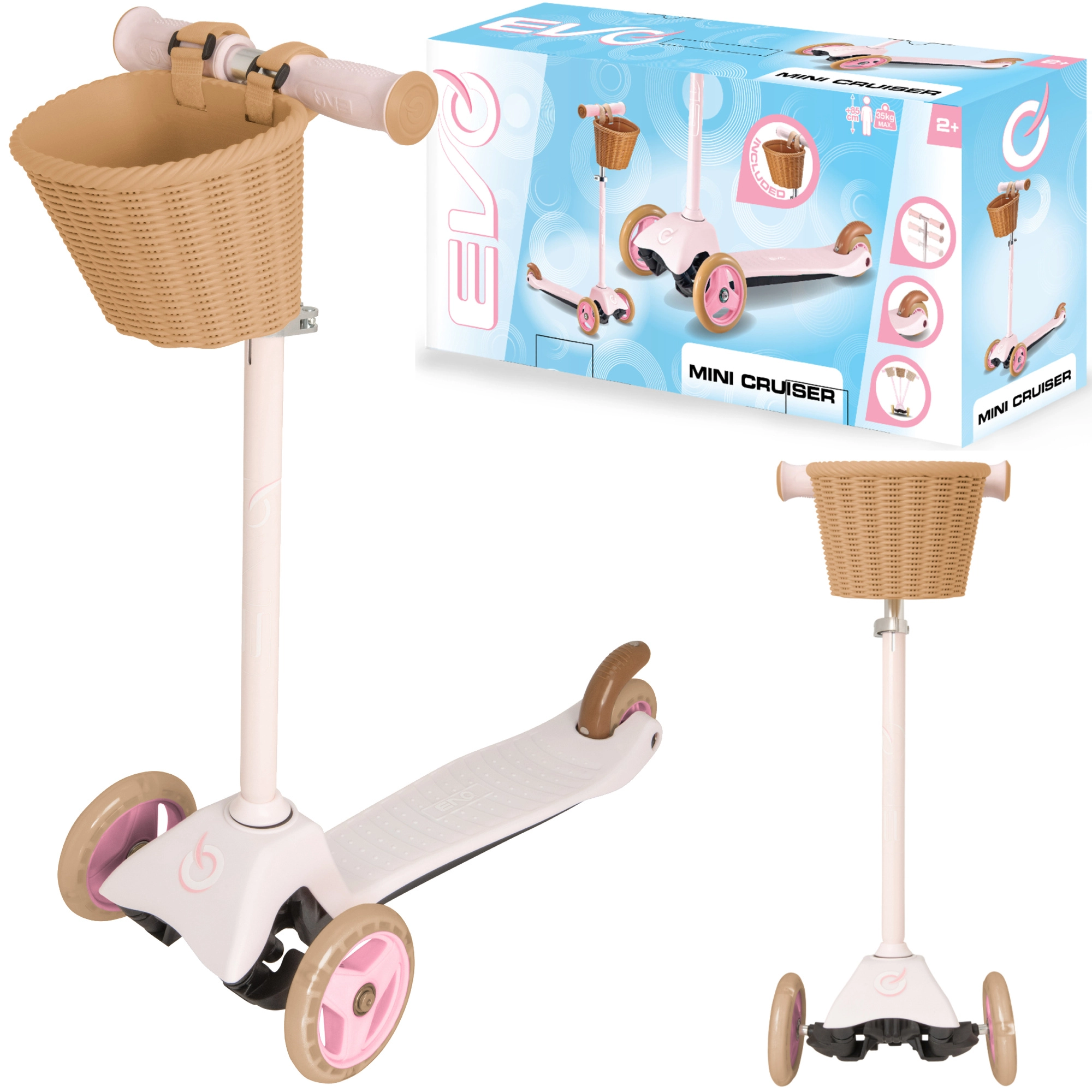 Розовата тротинетка EVO Mini Cruiser е идеална за най-малките ездачи от 2 години. Благодарение на трите колела, широката и стабилна платформа и задната крачна спирачка децата се учат на баланс и координация безопасно и забавно. Височинно регулируемото кормило расте заедно с детето, а подвижната кошничка побира дребни вещи за път.