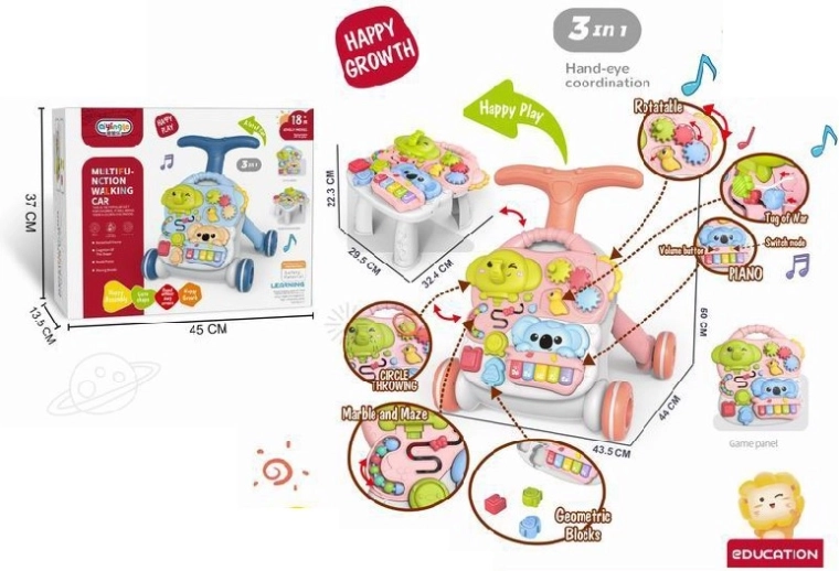 Многофункционалната проходилка и образователна масичка 3 в 1 подпомага естественото развитие на детето от 12 месеца. Предлага проходилка, масичка и сваляем интерактивен панел с пиано и елементи за развитие на моториката, сетивата и разпознаването на форми, цветове и звуци. Благодарение на стабилната конструкция, възможността за пълнене на крачетата с вода или пясък и гумираните колелца с ключалка играта е безопасна и плавна.