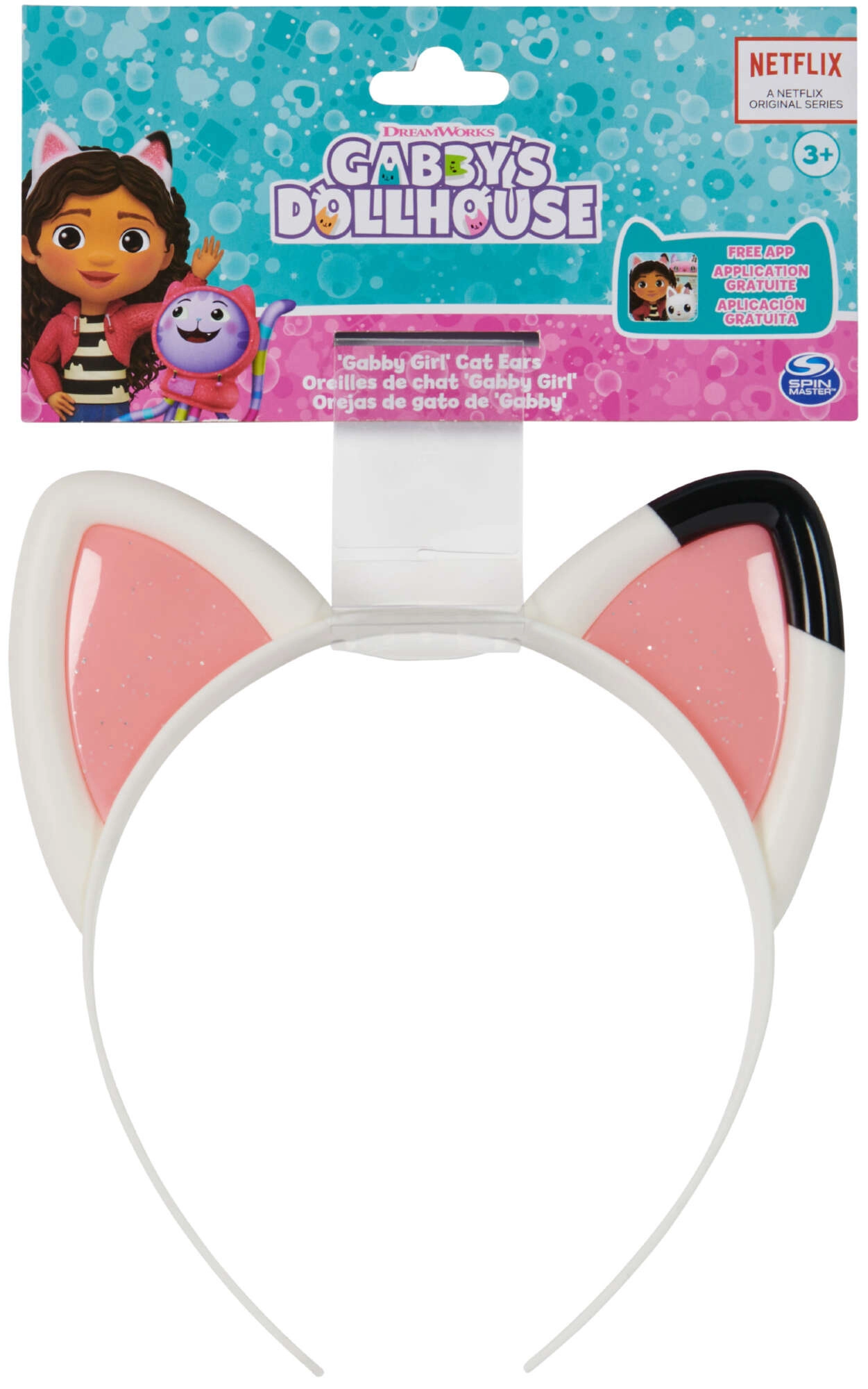 Влезте в света на фантазията с диадемата с котешки ушички от любимия сериал GABBY’S DOLLHOUSE. Бялата пластмасова диадема с розови блестящи детайли точно копира вида на ушичките, които носи Габи, и насърчава творческата игра, костюмите и ежедневното разкрасяване на прическата.