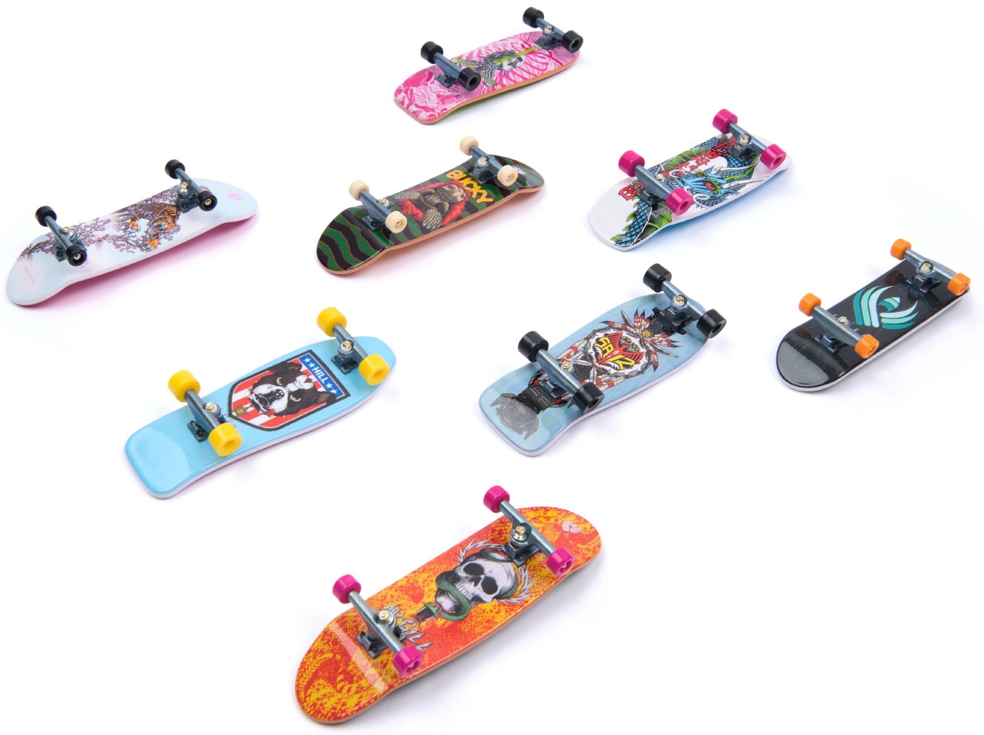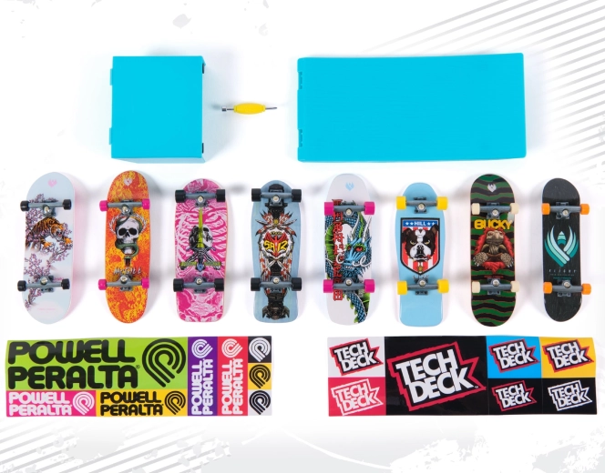 Комплектът включва осем напълно сглобени фингърборда с ярки цветни щампи и реалистични тракове и колелца. Страхотни за колекция и за ежедневно каране.