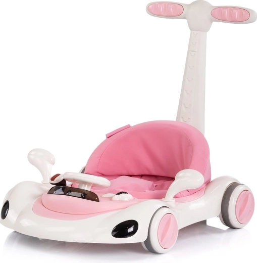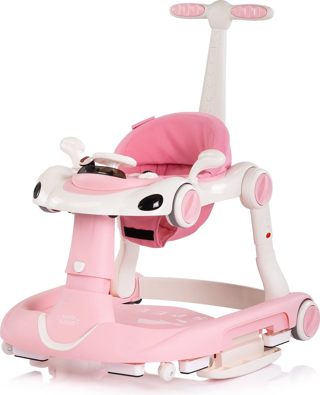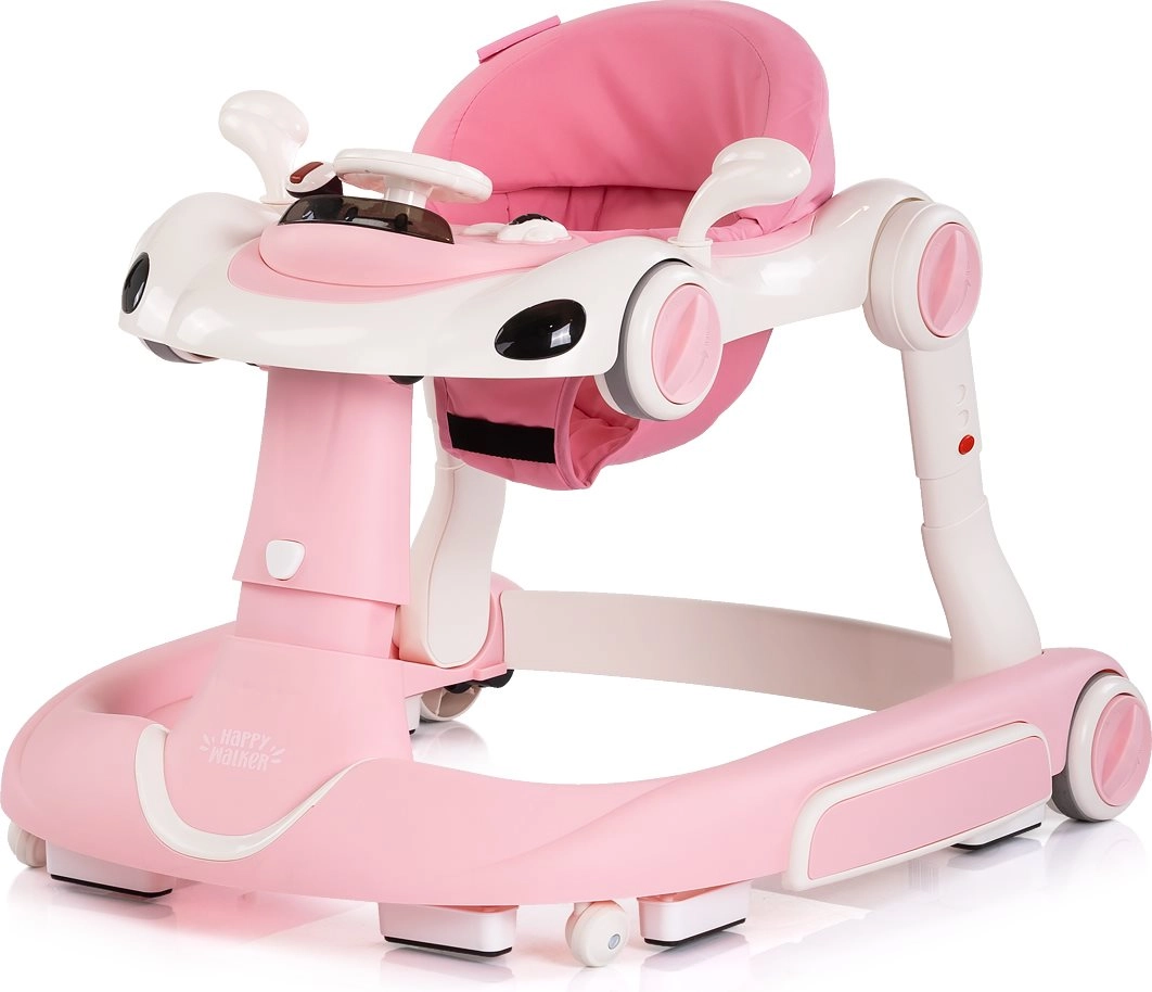 Универсалната проходилка 5-в-1 CHIPOLINO Happy Walker в розов цвят подпомага първите стъпки и забавното опознаване на света. Предлага стабилна конструкция, интерактивен игрови панел със светлини и музика, регулируема височина и родителска дръжка за безопасно водене. Благодарение на режим люлка и подскачане, антиплъзгащи подложки, спирачки и фиксация на колелцата е подходяща за ежедневна употреба и развитие на равновесие, координация и моторика.