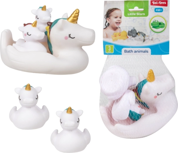 Този комплект животни за баня превръща всяко къпане в радостно приключение. По-голямото плуващо животинче (около 17 × 10 см) служи като „лодка“, която превозва двете по-малки животинчета (около 7 см). Мекият материал е приятен на допир и безопасен за малки деца, а пъстрите цветове подпомагат зрителната стимулация и развитието на фината моторика.