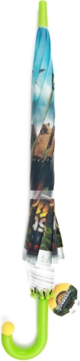 Чадърът има ръчен изстрелващ механизъм за бързо отваряне, безопасни накрайници на спиците и заоблен връх за по-спокойна употреба. Зелената J-дръжка стои удобно в ръка и лесно се окачва. Закопчаването с тик-так копче поддържа чадъра компактно сгънат, а опаковката в плик улеснява съхранението.