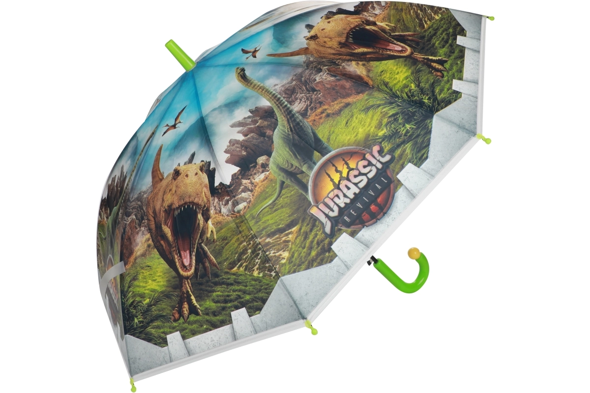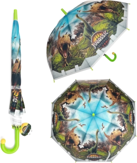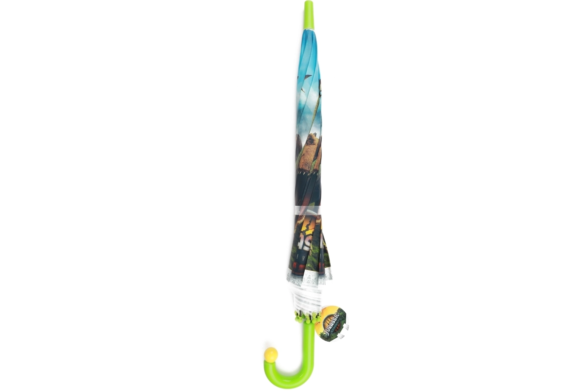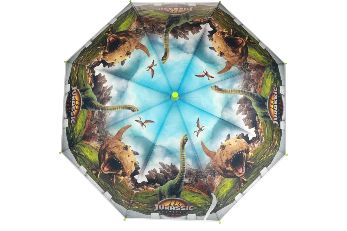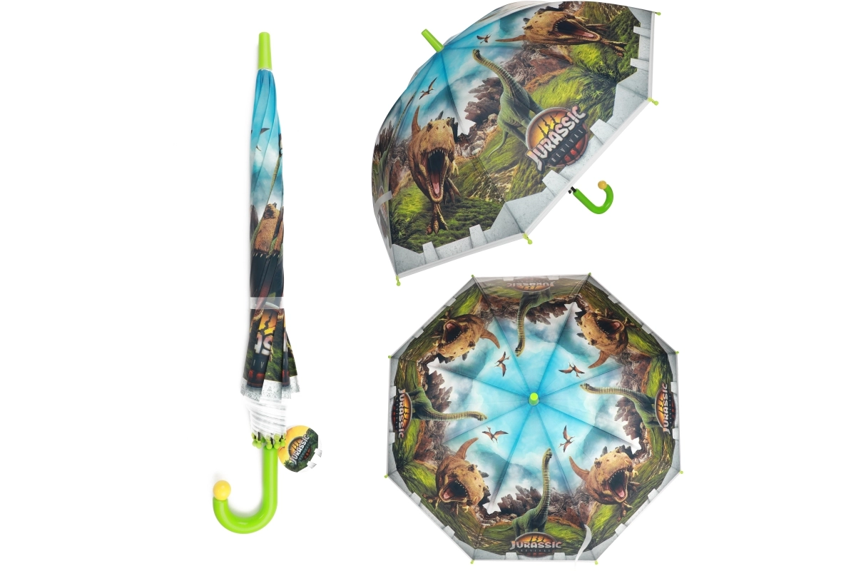 Открийте забавен и практичен аксесоар за дъжд: детски чадър с мотиви на динозаври и логото на Jurassic World. Пъстроцветният печат, издръжливият многосекционен текстилен купол и металните ребра гарантират, че детето остава сухо и същевременно се радва на оригинален дизайн.
