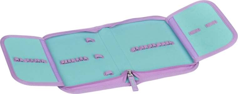 Част от комплекта е едноетажен несесер с два капака и качествен цип YKK – при разгъване предлага подредени ластичета и за триъгълни пастели, джобче за дреболии и прозорче за разписание. Лекият сак/торба за обувки или спорт е от здрав миещ се материал, със стягане с въженца и карабинка за лесно прикрепяне към раницата.