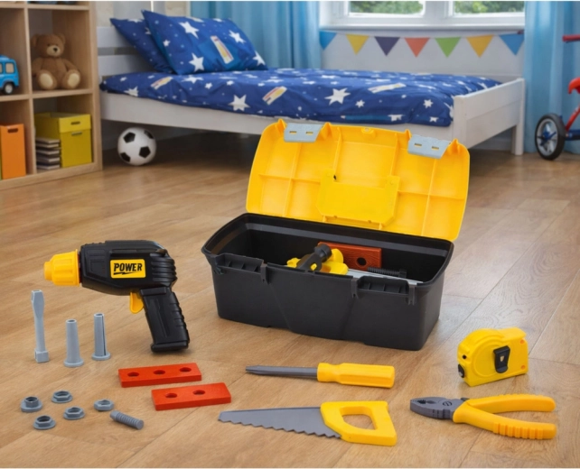 Този практичен комплект инструменти за деца предлага всичко, от което малкият майстор се нуждае: бормашина на батерии, чук, трион, отвертка, клещи, ролетка, винтове и строителни елементи. Издръжливото куфарче с дръжка държи всичко на едно място и улеснява носенето по време на път.