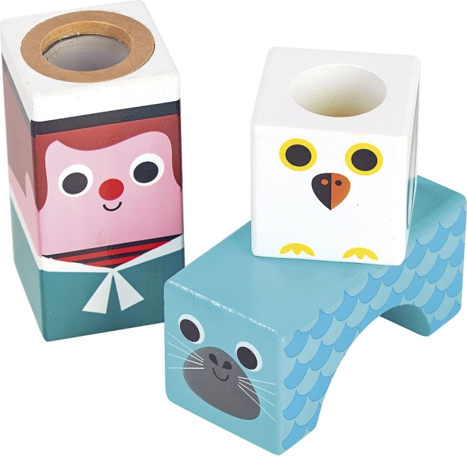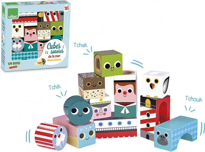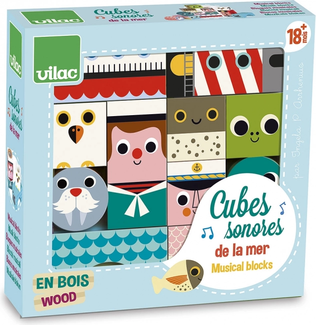 Сетивните дървени кубчета с морски мотиви носят на децата радост от откриването на форми, цветове и звуци. При разклащане и строене децата тренират захвата, координацията и концентрацията, докато различните звукови елементи подпомагат слуховото им възприятие. Илюстрациите от Ингела П. Аррениус придават на комплекта уникално ретро излъчване и игрив характер.