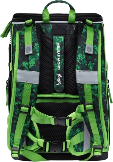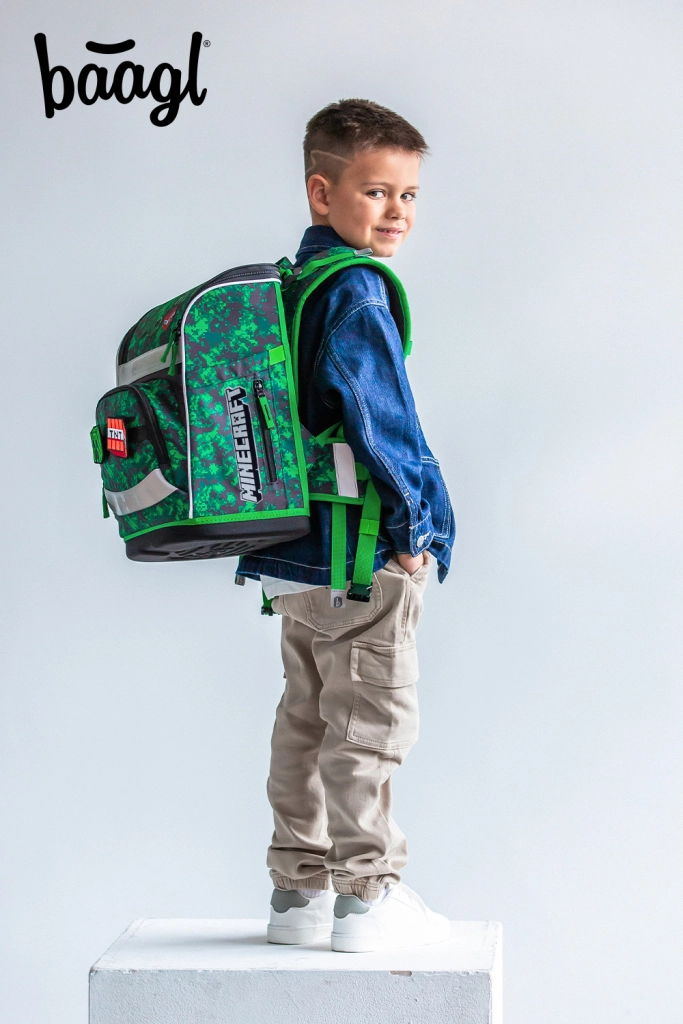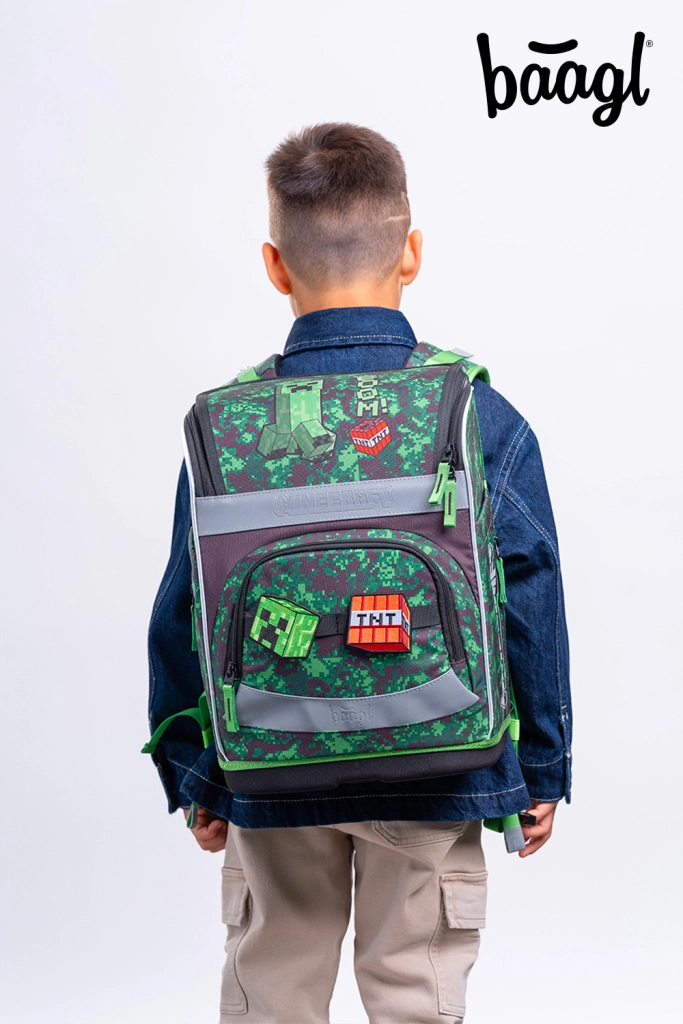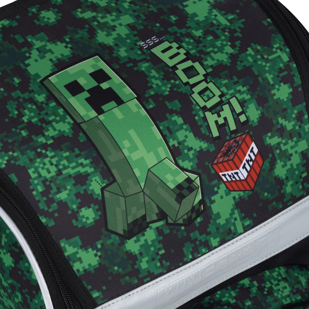 Целият комплект е с геймърски мотиви MINECRAFT с пикселна камуфлажна щампа и светлоотразителни елементи за по-добра видимост. Циповете YKK осигуряват дълъг живот и плавно закопчаване, а рециклираните, водоустойчиви материали издържат на натовареното училищно ежедневие.