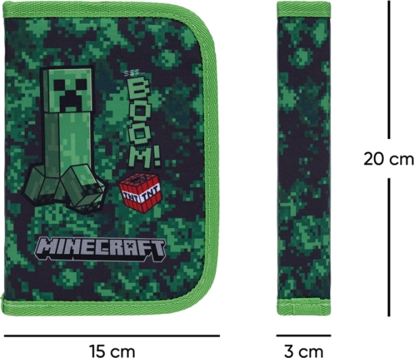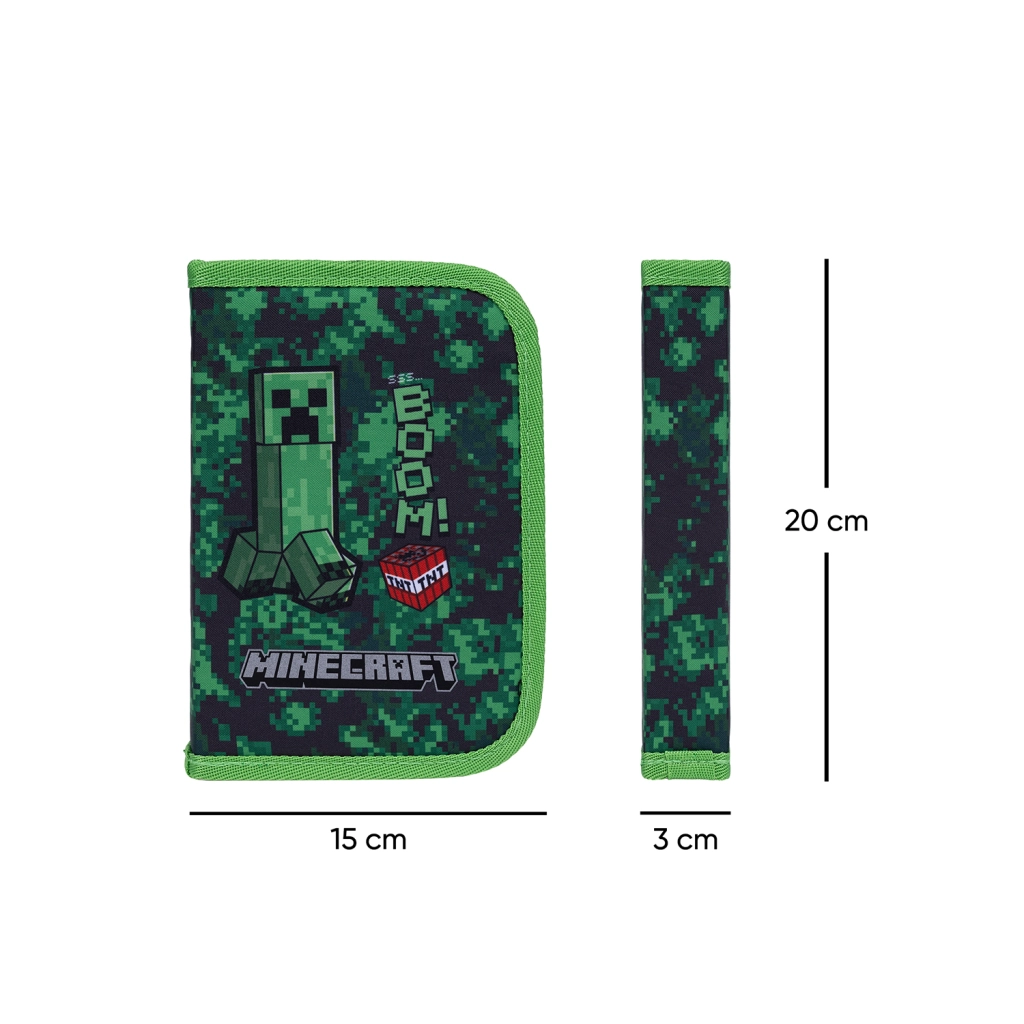 Стилен ученически несесер с мотив MINECRAFT Boom предлага практично едноетажно изпълнение с два клапана, издръжлив цип YKK и прегледно подредяване. Вътре ще откриете джобче за дребни вещи, прозорче за разписание и здрави ластици, съвместими и с триъгълни моливи и флумастери. Несесерът е без съдържание и е изработен от рециклиран материал.