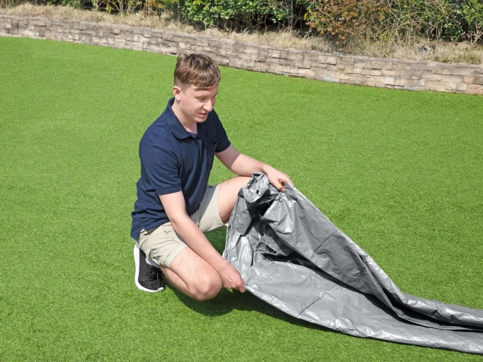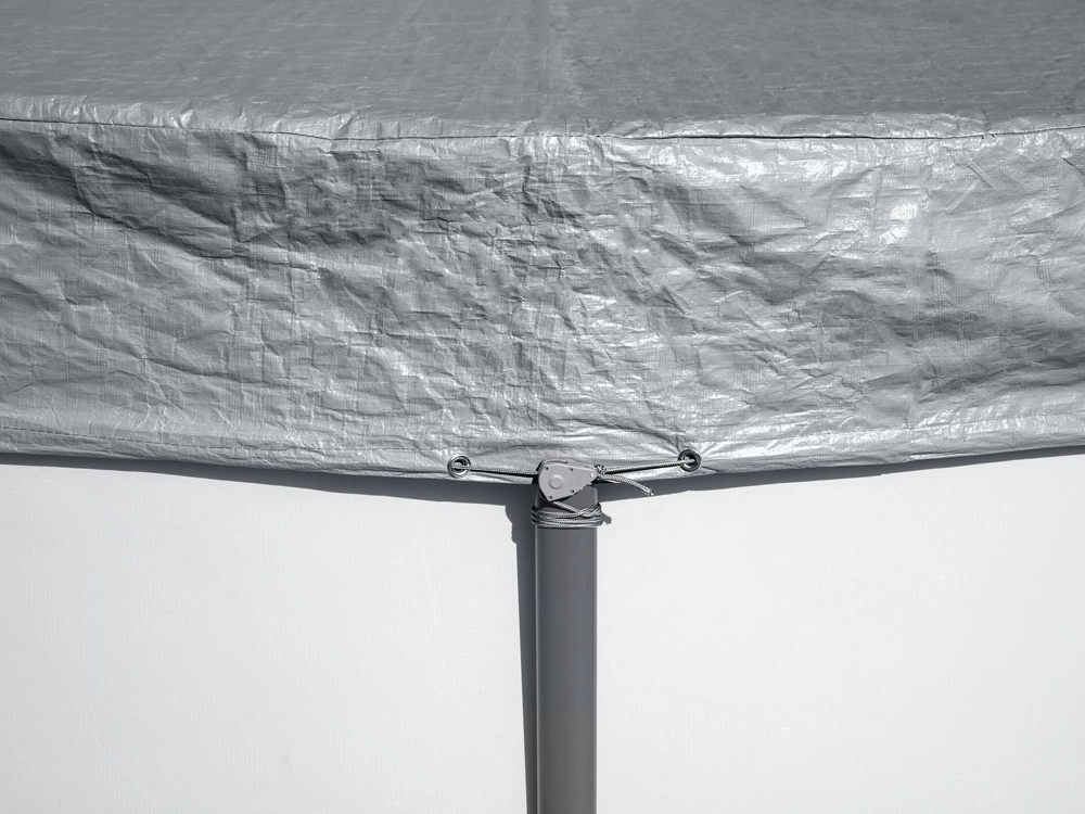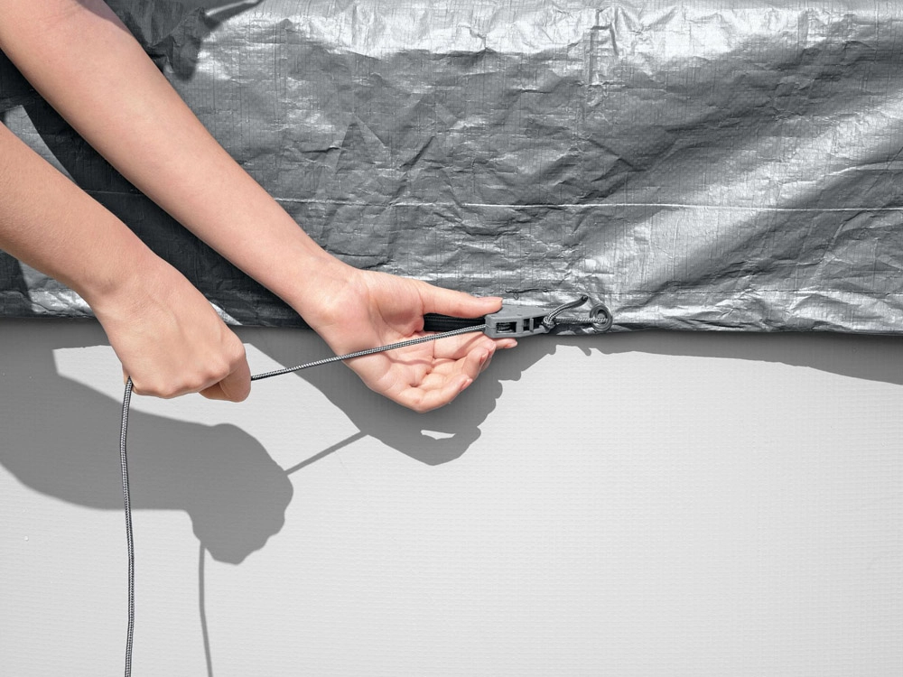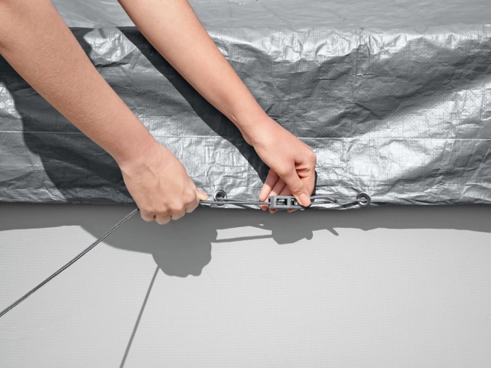 Умните дренажни отвори пропускат дъждовната вода, така че върху покривалото не се образуват локви. Ветроустойчивият стягащ механизъм и пристягащото въже осигуряват плътно прилепване по обиколката, за да стои покривалото на място и при по-неблагоприятни метеорологични условия.