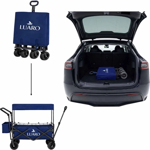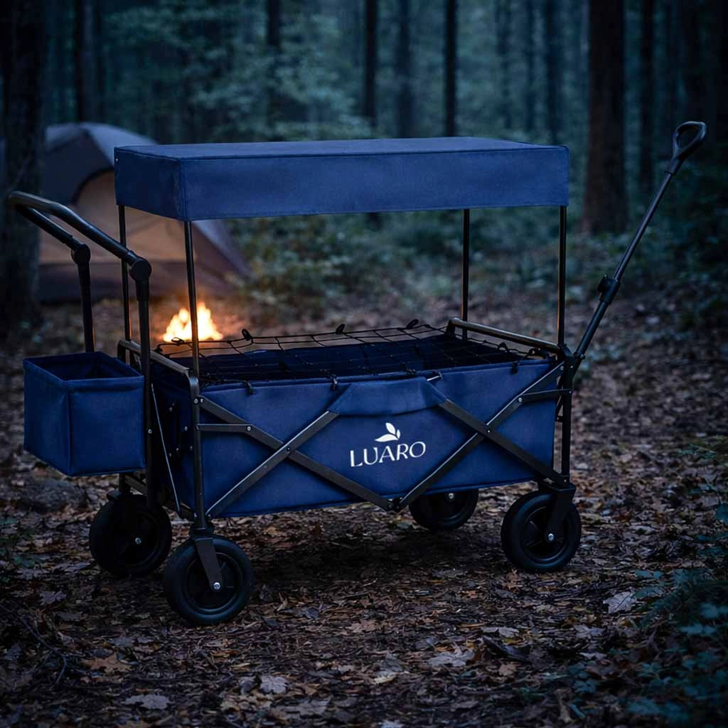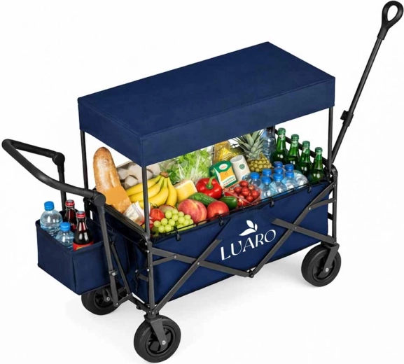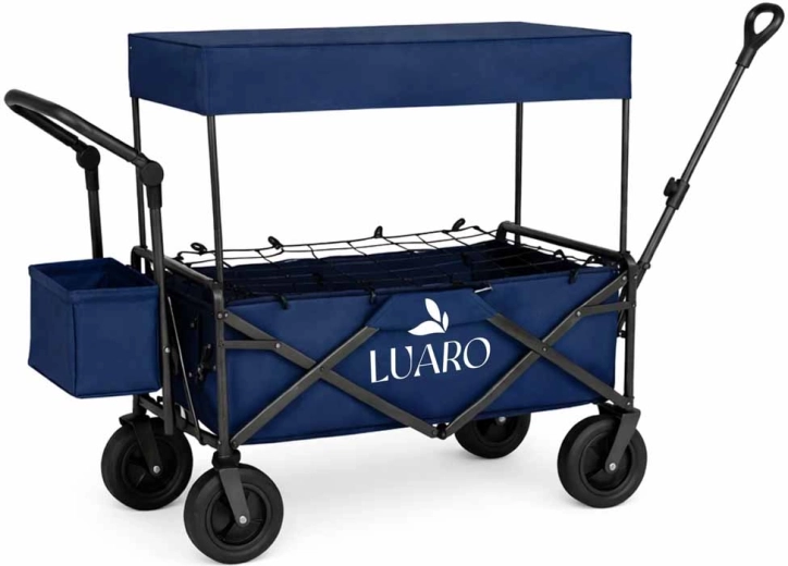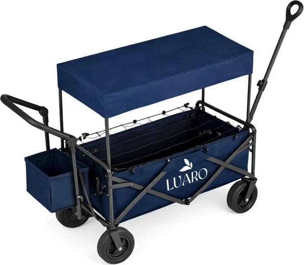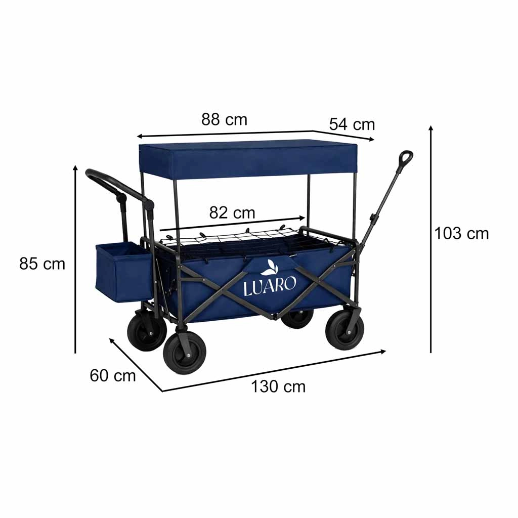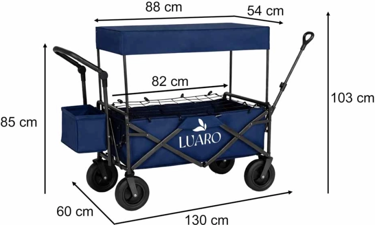 Универсалната сгъваема количка LUARO със сенник улеснява пренасянето на вещи до плажа, къмпинга и в града. Благодарение на здравата конструкция, широките офроуд колела, въртящите се предни колелца и регулируемите ръкохватки се управлява лесно. Практичният сенник предпазва съдържанието от слънце и лек дъжд, а страничните джобове и кошът осигуряват подредено съхранение на необходимите вещи.