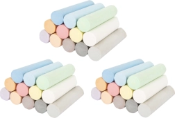 Този изгоден комплект съдържа три отделни кутии по 12 броя цветни тебешири, общо 36 броя. Широката палитра от пастелни цветове вдъхновява децата да творят както на открито, така и у дома. Благодарение на по-големите размери и по-здравото сечение тебеширите се държат удобно в детската ръка, ронят се по-малко и оставят наситена следа.