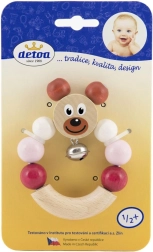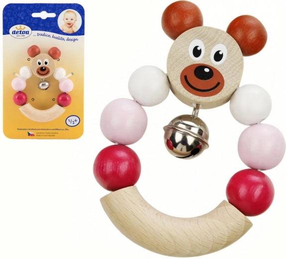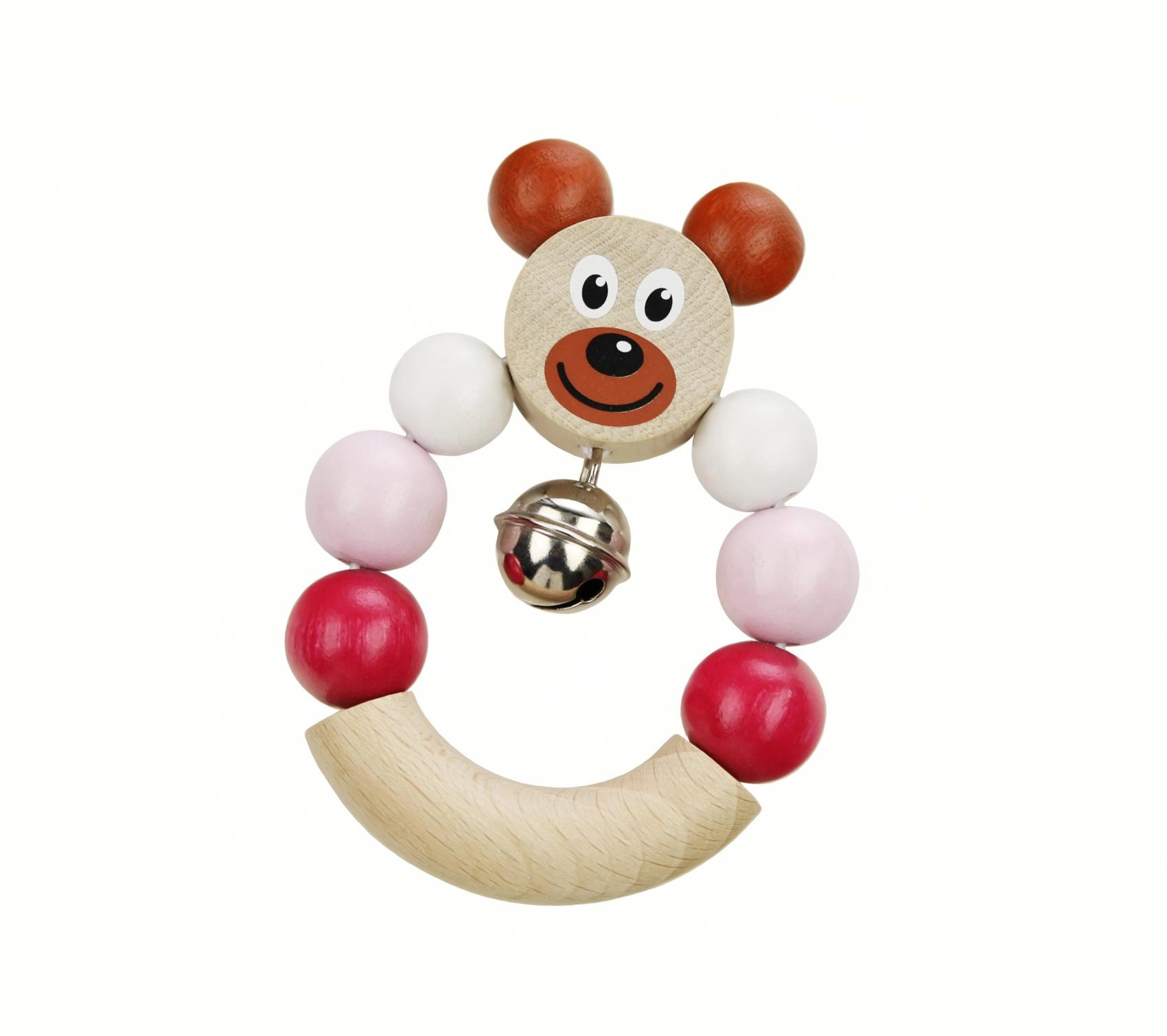 Очарователна дървена дрънкалка с мече в розов цвят ще зарадва всяко бебе. Вградената звънчалка звъни нежно, дрънкалката е много лека и благодарение на компактните размери 7 × 9 cm се държи отлично в малките ръчички. Продуктът отговаря на строгите изисквания на ЕС за безопасност на играчките и притежава сертификат Безопасни играчки.