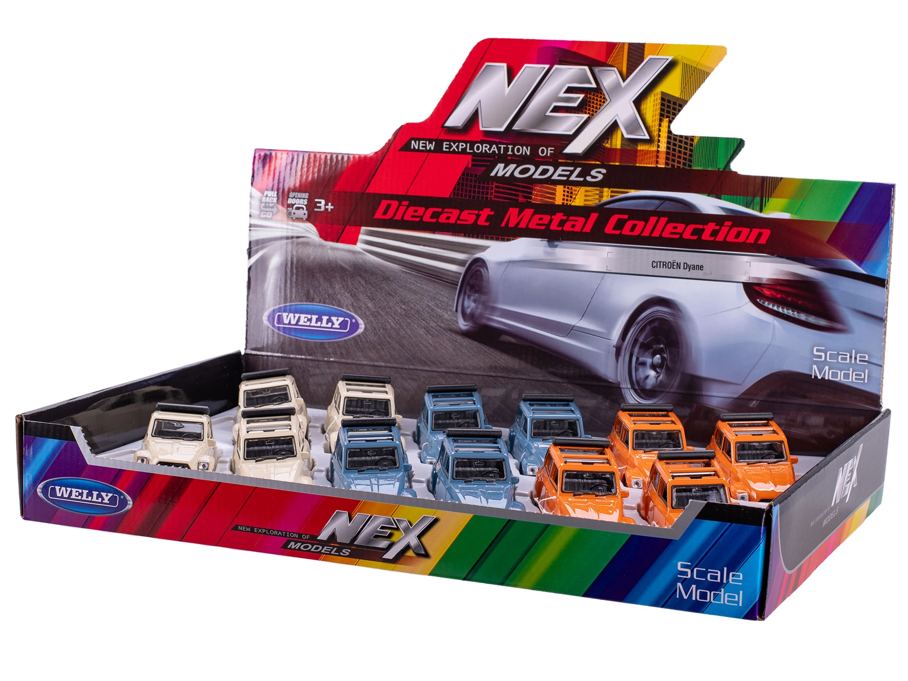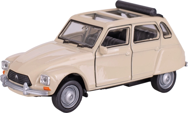 Детайлно изработен метален модел на легендарния автомобил CITROËN DYANE от марката Welly ще зарадва колекционери и деца. Предлага обратно задвижване за забавно каране, здраво метално изпълнение с пластмасови детайли и автентичен дизайн. Наличен в три цвята – син, бял и оранжев. Идеален подарък за деца от 3 години и за любители на класическите автомобили.
