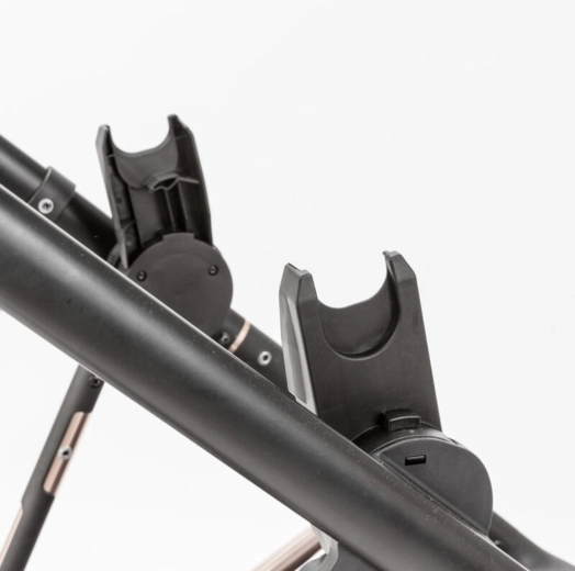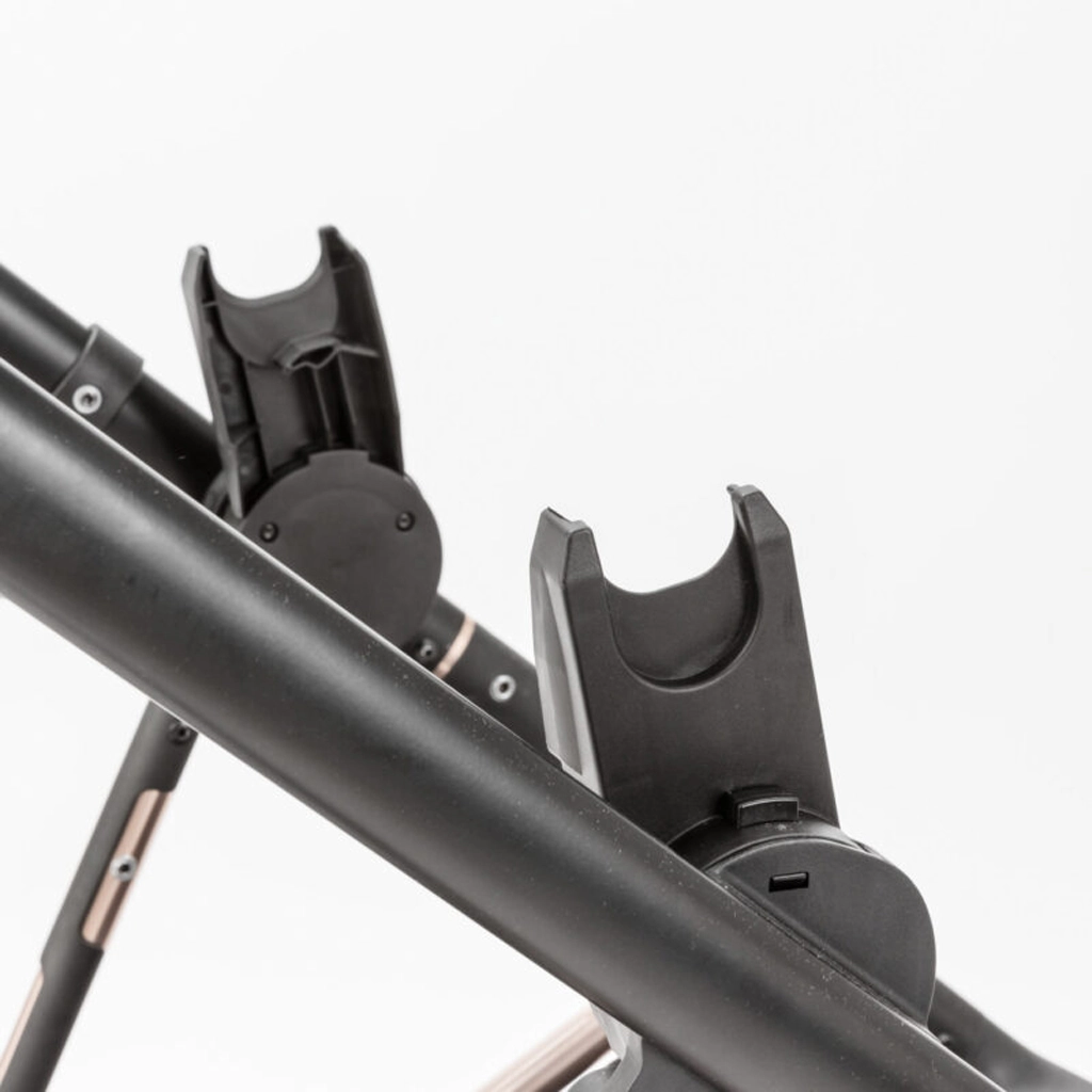 Поставете адаптерите в монтажните отвори на рамата на количката, докато щракнат осезаемо и чуваемо, след което закрепете столчето за кола. Преди всяка употреба проверявайте здравината на фиксацията. За демонтаж първо свалете столчето според неговата инструкция и натиснете бутона за освобождаване на заключващия механизъм на адаптерите.