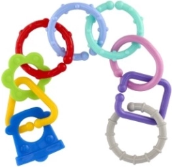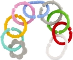 Ринговете и формите се свързват лесно и стоят здраво едни към други, за да могат децата да правят вериги и да прикрепят играчки към количка или столче за кола.