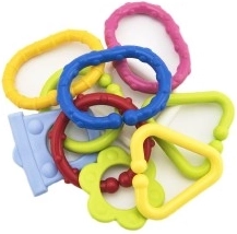 Забавният дрънкащ звук успокоява децата, а безопасните материали позволяват играчката да се използва и като гризалка.