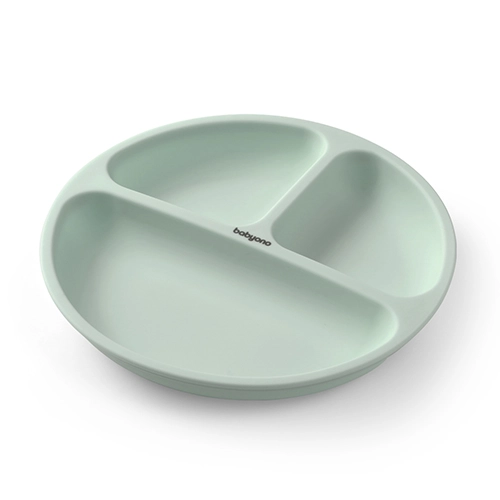 Открийте умното хранене с детската силиконова чиния BabyOno. Голямата вендуза стои стабилно върху гладка повърхност и помага да се предотвратят разливания или изпускане на чинията. Трите отделения разделят порциите и улесняват въвеждането на нови храни в менюто.