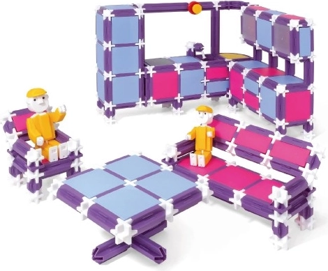 Конструкторът SEVA RODINA – Жилище предлага пъстри възможности за малки строителки и строители. Благодарение на комбинацията от лилаво, розово и светлосиньо възникват оригинални модели, които ще зарадват всяко дете. Сглобете удобно „летище“ – широка легло, модерна ъглова кухненска секция с мивка и вградена хладилник, кът за хранене, диван, рафтчета, шкафчета и практични етажерки.