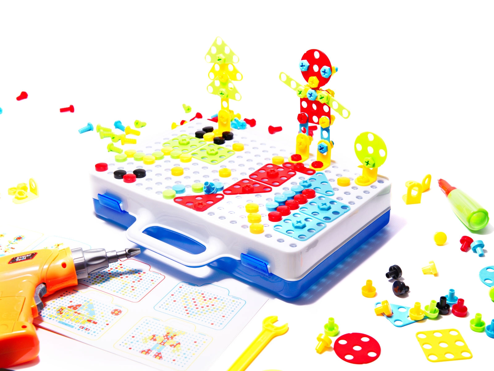 Комплектът включва пъстри винтове и елементи, които привличат вниманието на децата и помагат за развитието на фината моторика.
