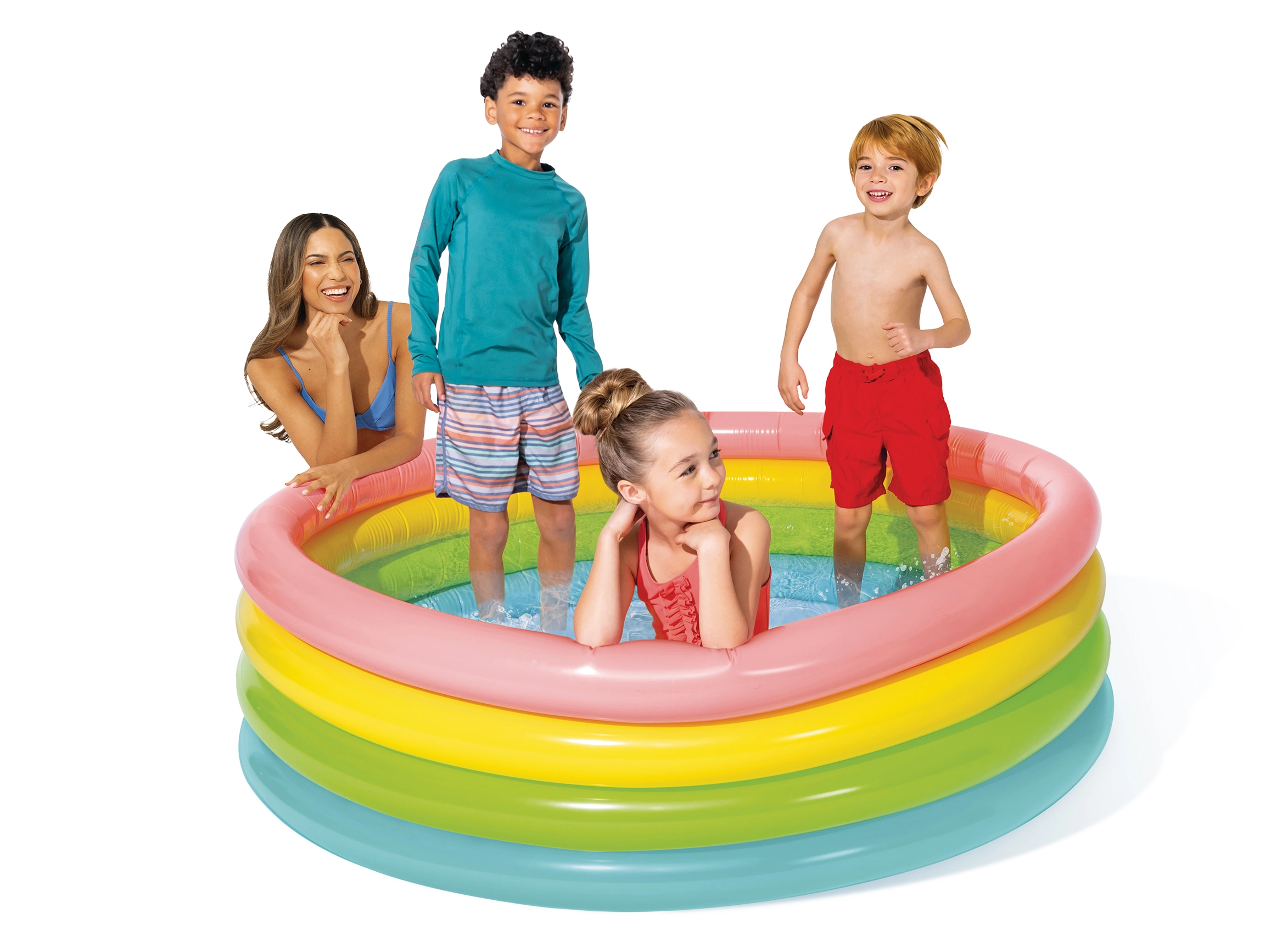 Монтажът отнема съвсем малко време: достатъчно е да го разстелете на равна повърхност, да надуете отделните рингове и да напълните с вода. Цветният дизайн приканва към игра и оживява всеки двор или тераса.
