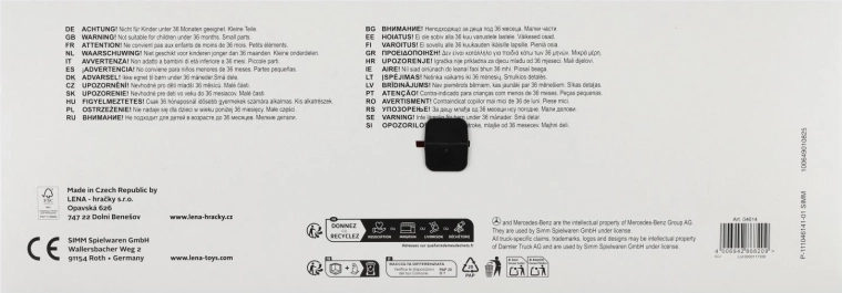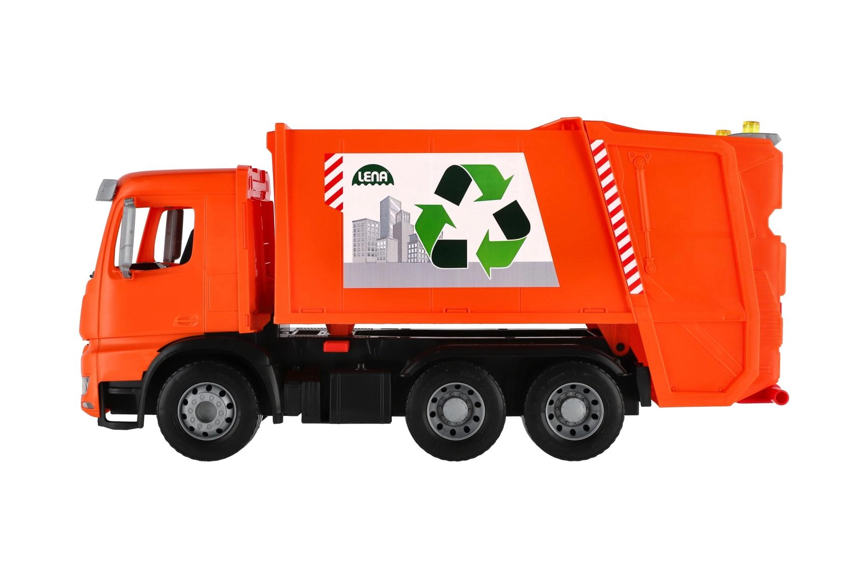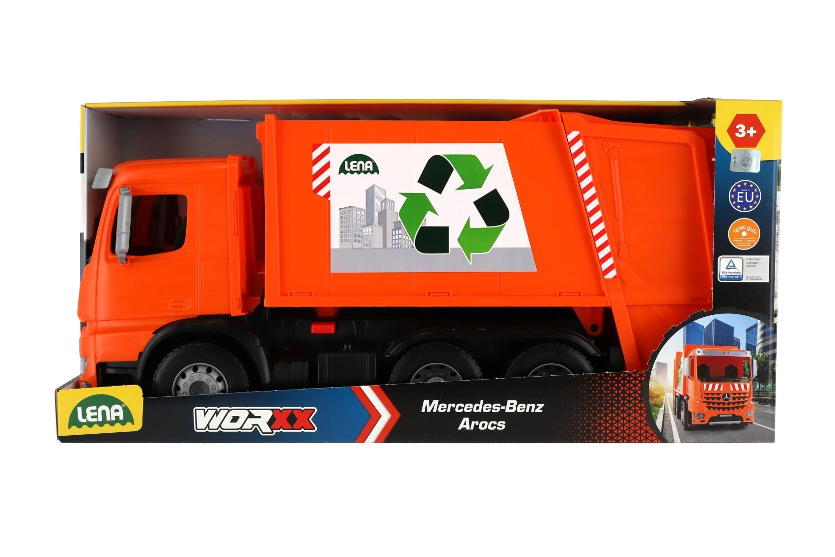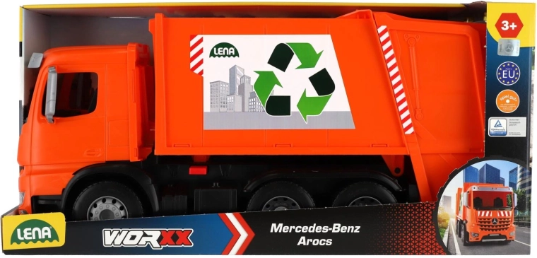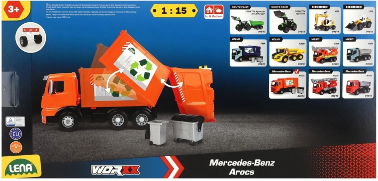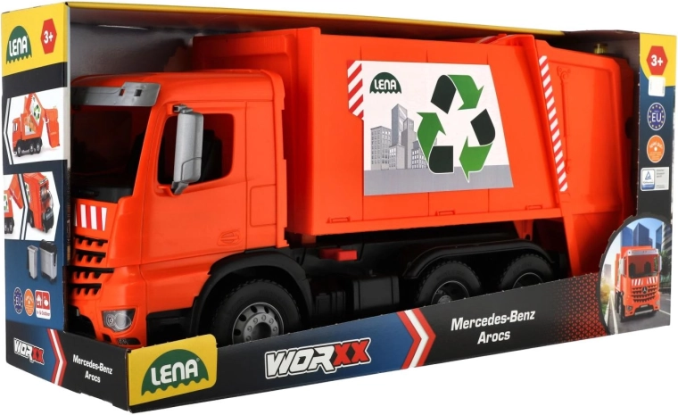 Сметосъбиращият камион MERCEDES AROCS от LENA е детайлно изработено превозно средство за малки любители на техниката. Благодарение на robustната изработка от качествена, устойчива пластмаса и здравите метални оси на колелата издържа на ежедневна игра вътре и навън. Функционалната задна част с предпазител позволява безопасно товарене и разтоварване на отпадъци.
