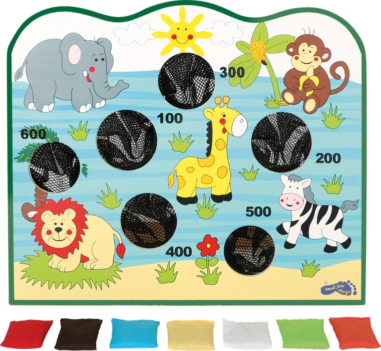 Игралната дъска с цветни илюстрации на животни и цветните торбички правят играта атрактивна и забавна за децата.