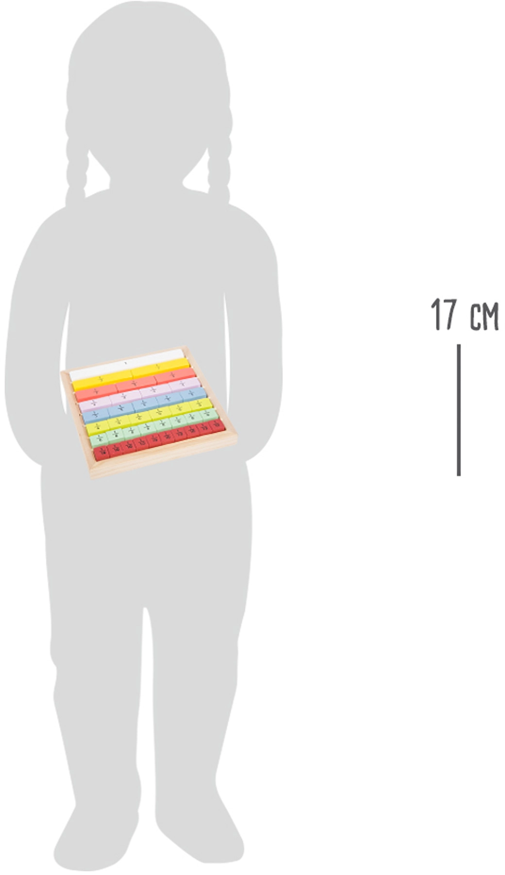 Тази висококачествена образователна помощ от Small Foot предлага на децата цветен и нагледен начин на учене. 39 дървени елемента с различна дължина и цвят и с отпечатани числа помагат да се разбере принципът на дробите и тяхното съединяване в цяло. Благодарение на здравото дърво от 100% FSC източници играта е издръжлива и щадяща природата.