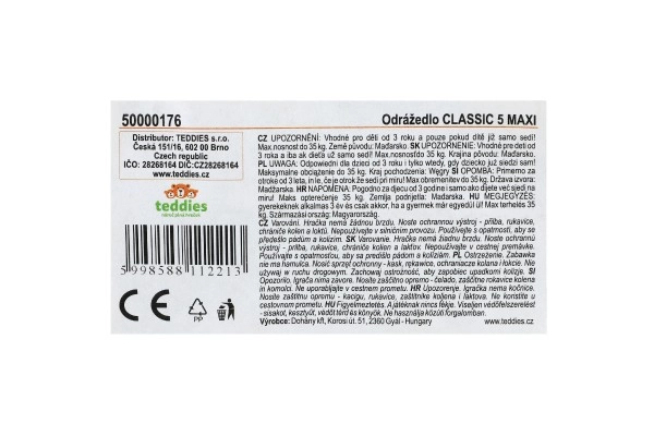 Колелото за бутане Classic 5 Maxi е изработено от издръжлива пластмаса и е идеален спътник за активни деца. Има височина на седалката 33 cm и може да носи деца до 35 kg, което го прави перфектен избор за деца от различни възрасти.