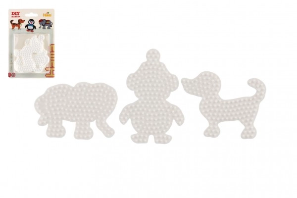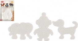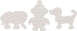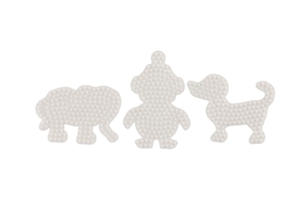 Комплектът подложки Hama за термо мъниста позволява на деца от 5 години да създават цветни изображения с помощта на бели пластмасови подложки във формата на слон, пингвин и кученце.
