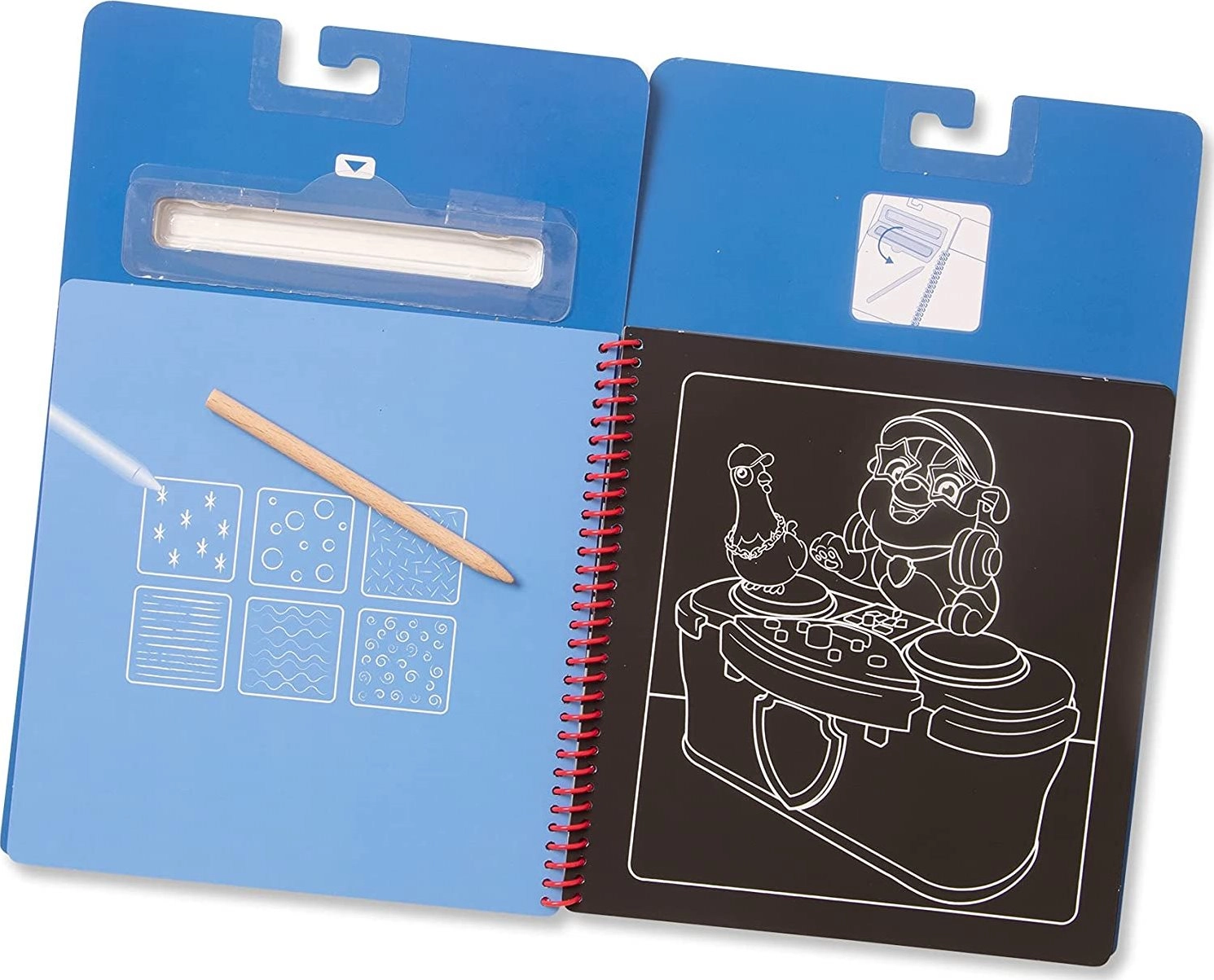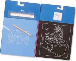 Достатъчно е да вземете включеното дървено шило, леко да надраскате черния слой и отдолу ще се появят многоцветни рисунки. Приложените шаблони и стикери помагат на децата да създават собствени мотиви и да развиват фината моторика, креативността и търпението.