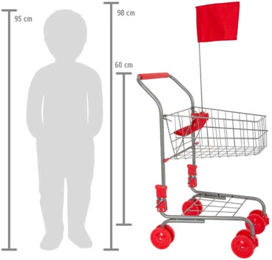 Кошницата предоставя достатъчно място за хранителни продукти, играчки и аксесоари за детския магазин. Практичната сгъваема седалка за кукла или плюшена играчка прави играта още по-реалистична. Комбинацията от метал и издръжлива пластмаса гарантира дълъг живот при ежедневна употреба.