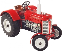 Класическият модел трактор Zetor 50 Super в мащаб 1:25 ще зарадва както колекционери, така и деца. Задвижването се осигурява от пружинен механизъм с ключ, налични са четиристепенна скоростна кутия, задна скорост, неутрал и ръчна спирачка. Предният мост е управляем с волан, а металната изработка придава на играчката истинска здравина.