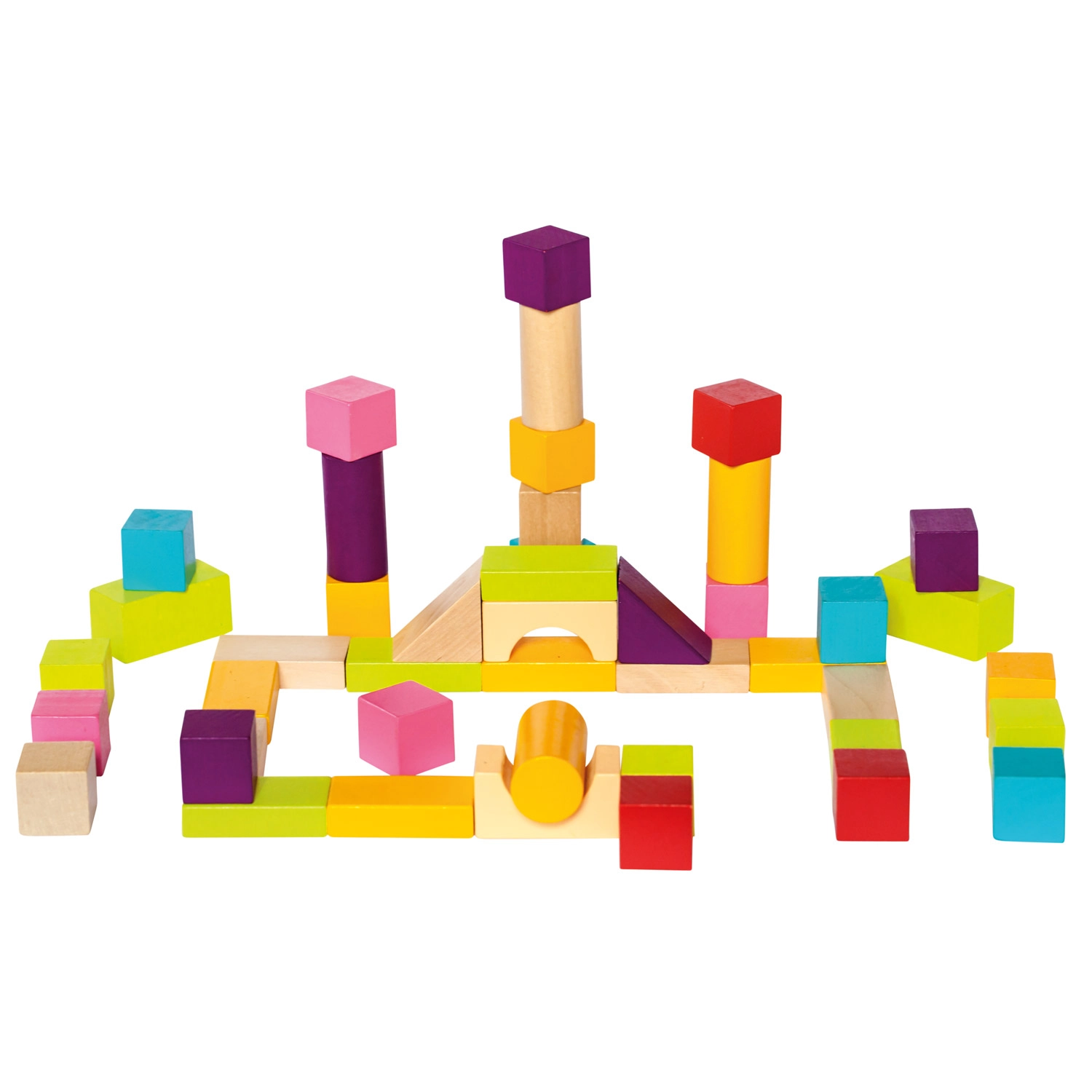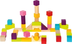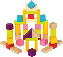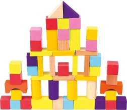 Благодарение на разнообразните форми – кубчета, цилиндри, дъги и триъгълници – децата строят кули, къщички и фантастични конструкции. Гладкото, качествено обработено дърво и пъстрите цветове подпомагат сетивното развитие и креативната игра.