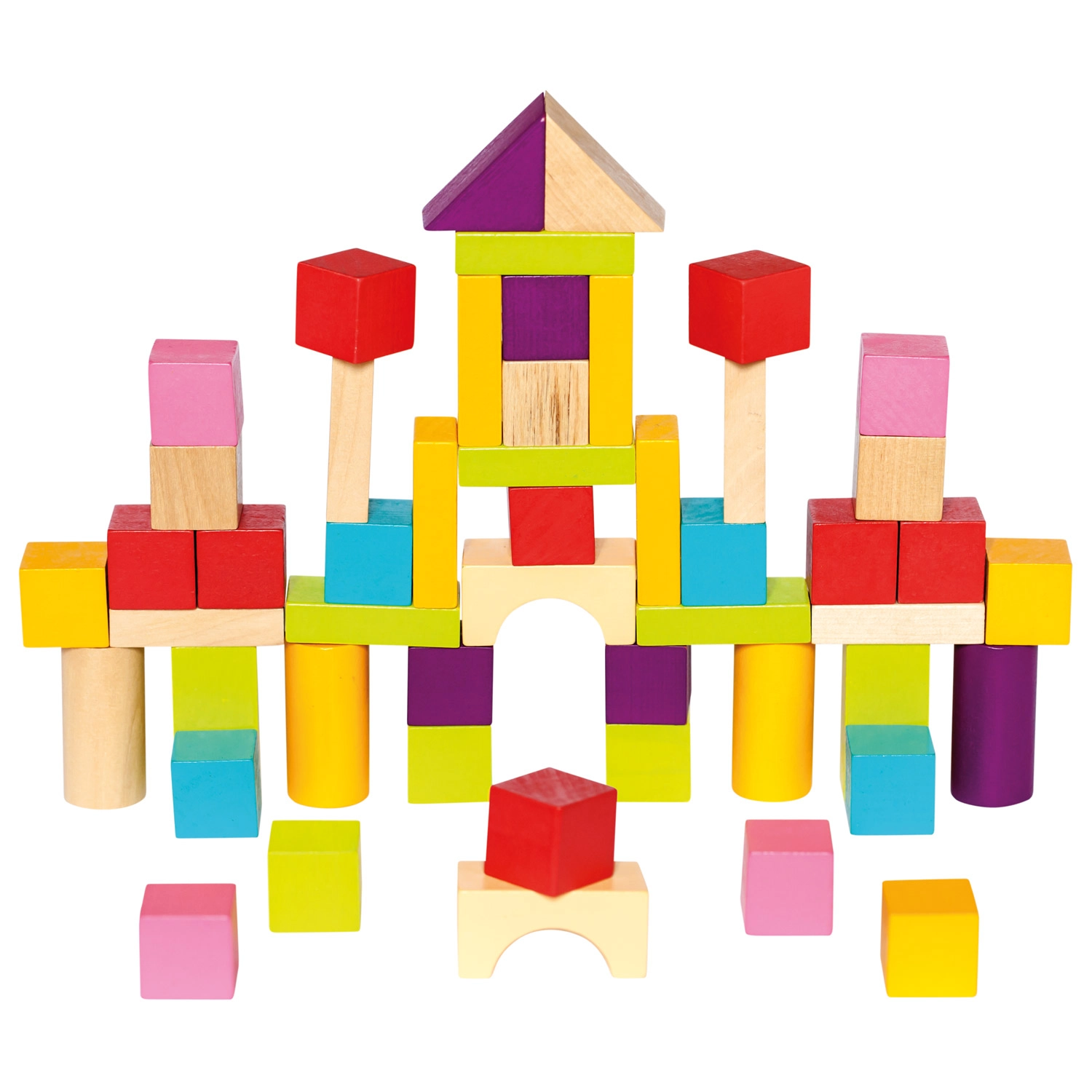 Този комплект от 50 дървени кубчета в нови, ярки цветове е идеален за първи постройки, сортиране и опознаване на формите. Здравата кофа с дръжка улеснява подреждането и пренасянето, а капакът същевременно служи като формичка за сортиране за забавно трениране на координацията око–ръка.