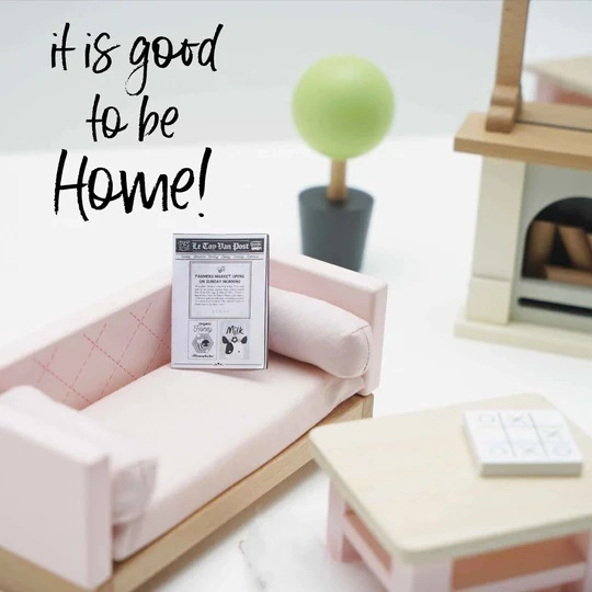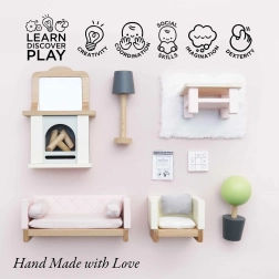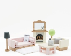 Комплектът съдържа 19 части: диван и кресло с текстилни възглавници, холна маса, камина с дърва и огледало, килим, цвете в саксия и лампа. Размерите са подходящи за къщи за кукли от Le Toy Van. Допълнителни аксесоари за къщи от серията Daisylane са налични на нашия уебсайт.