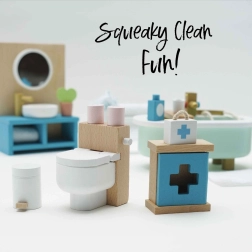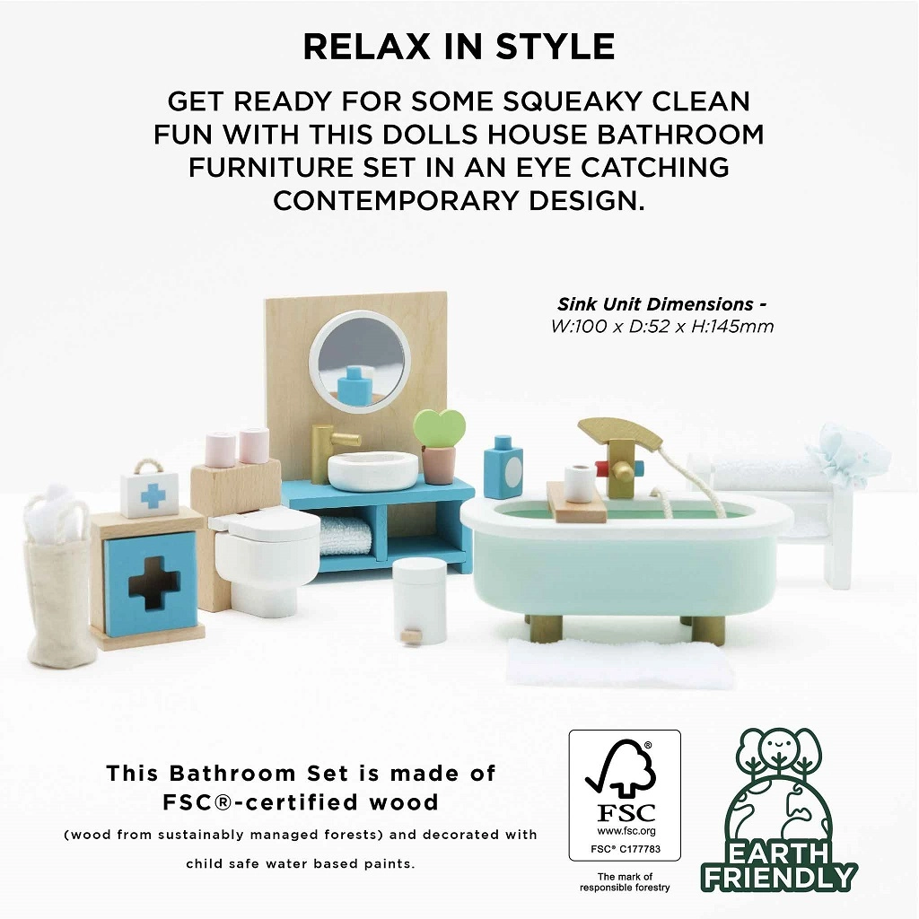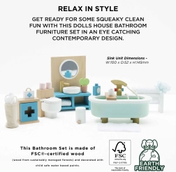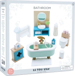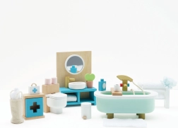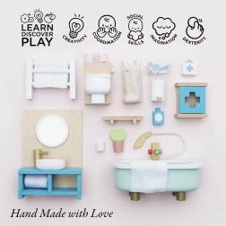 Стилeн комплект баня за къща за кукли в мащаб 1:12 от марката LE TOY VAN. Включва вана, тоалетна, мивка, закачалка за кърпи и аптечка, ръчно дооцветени с нетоксични бои на водна основа. Произведен етично от устойчиви материали, подпомага креативната игра, комуникационните умения и координацията.